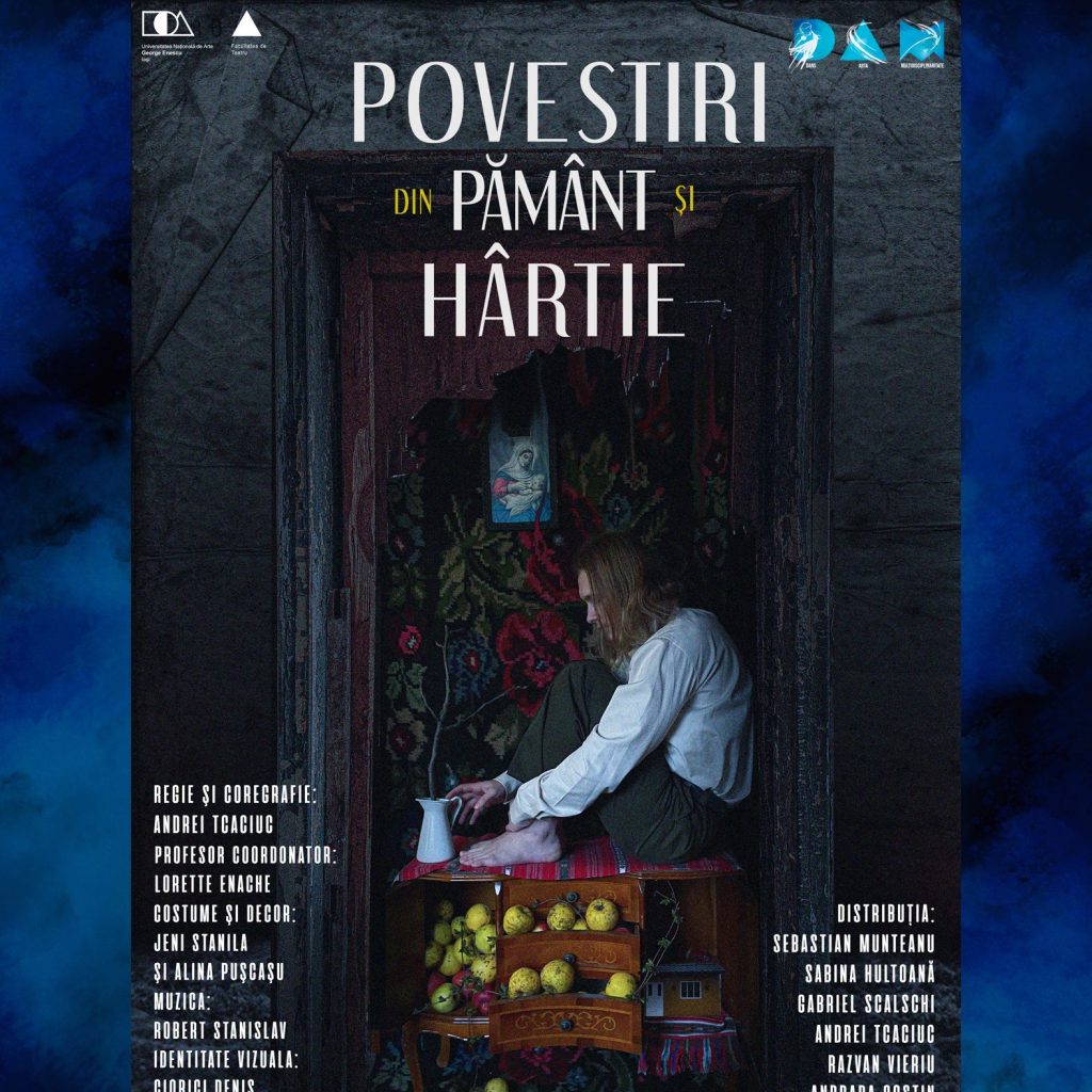 Andrei Tcaciuc este, de asemenea, absolvent al UNAGE Iași. Spectacolul său, „Povestiri din pământ și hârtie”, are o puternică notă personală. Este povestea bunicii sale, victimă a deportărilor din timpul celui De-al Doilea Război Mondial. Putem vorbi, în acest caz, și despre o inovație: teatru dans documentar. Reportajul realizat de jurnalistul și scriitorul Viorel Ilișoi, care a scris povestea acestei femei, bunica lui Andrei Tcaciuc, l-a inspirat pe tânărul artist. Spectacolul a conținut inclusiv fragmente din filmările lui Viorel Ilișoi. Imaginea „bunicii universale”, cum a numit-o criticul de teatru Călin Ciobotari, conf. univ. dr. și director al Școlii Doctorale de Teatru de la UNAGE, a mișcat ceva în fiecare spectator. Coregraful francez Guillaume Siard, director în cadrul Companiei Preljocaj, care a asistat la reprezentație, s-a declarat impresionat și a spus că a regăsit și imaginea bunicii sale în acel spectacol. Dansul contemporan a descris în mișcări expresive, interpetate cu mult talent și sensibilitate de dansatorii din distribuție, povestea spusă în reportaj.