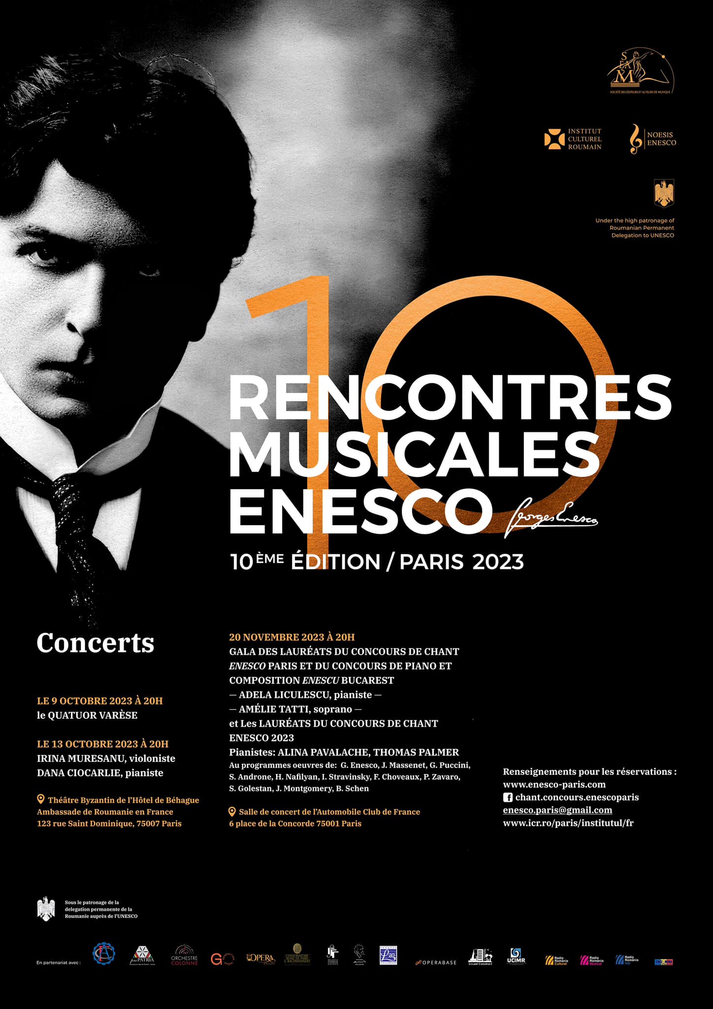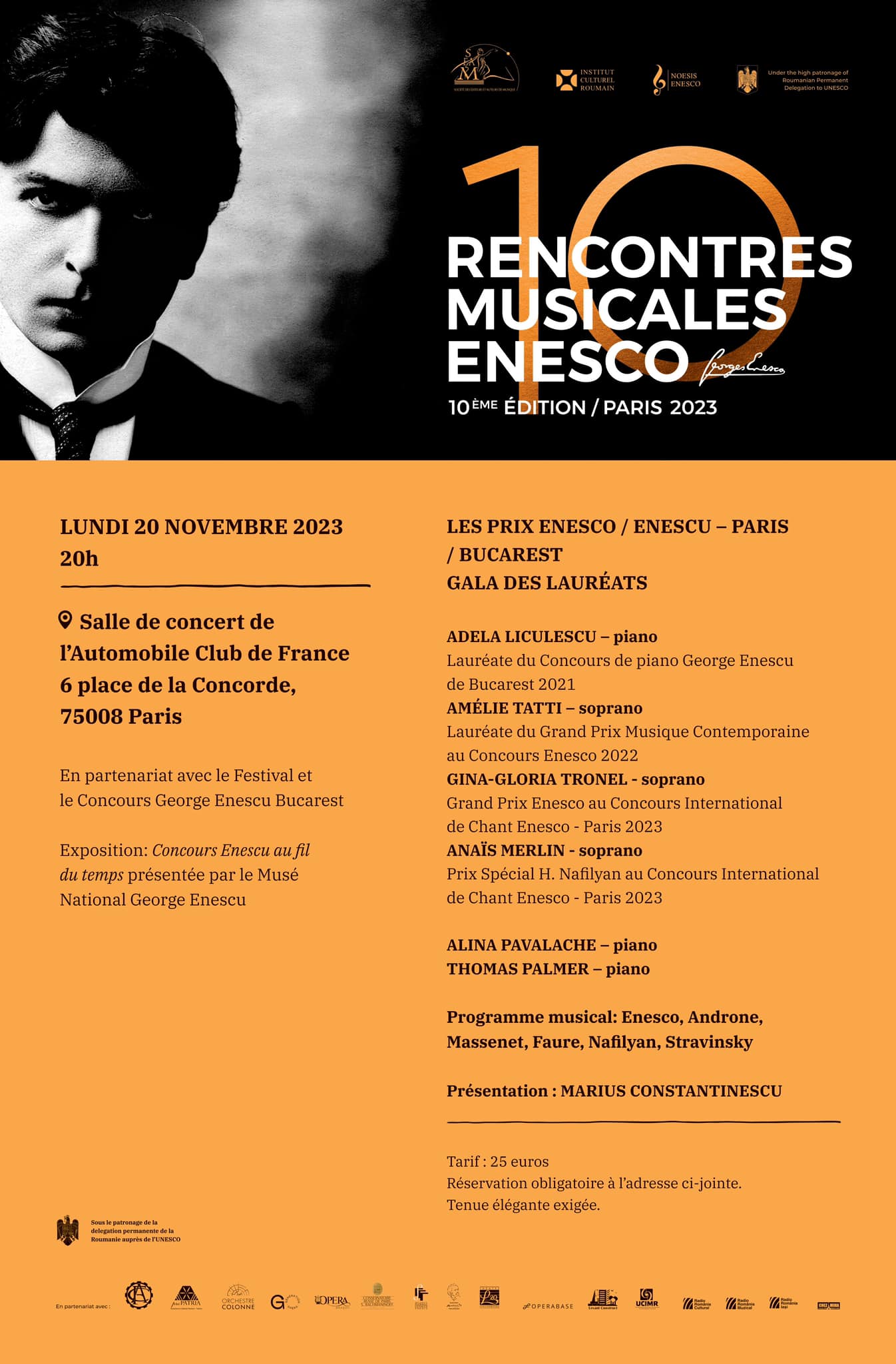 Rencontres Musicales Internationales Georges Enesco va culmina pe 20 noiembrie la Auditoriul Automobile Club de France, unde sunt invitați laureați ai celor două concursuri gemene, Georges Enesco (canto) de la Paris și Enescu (vioară, violă, cello și compoziție) de la București (vezi afișele la finalul articolului)