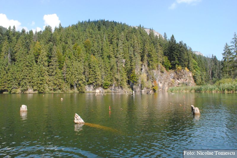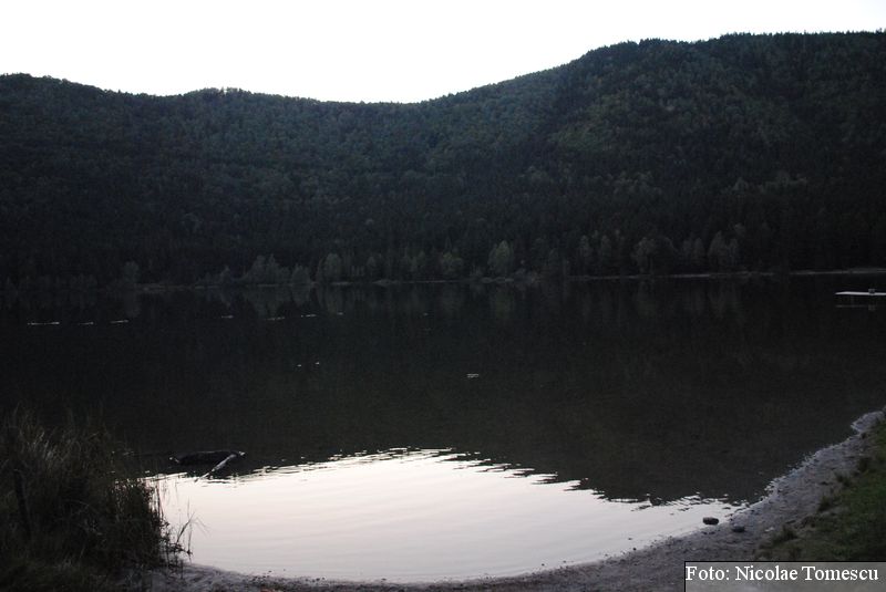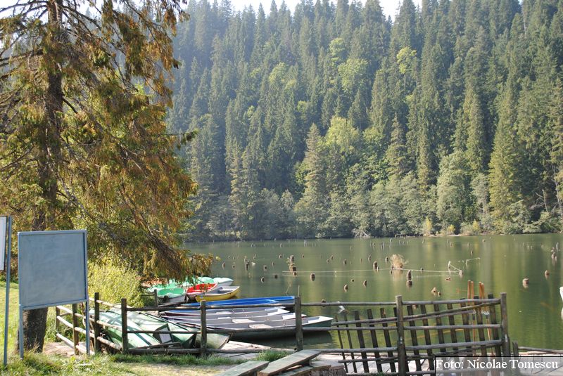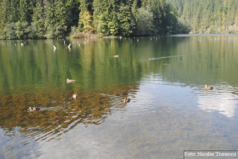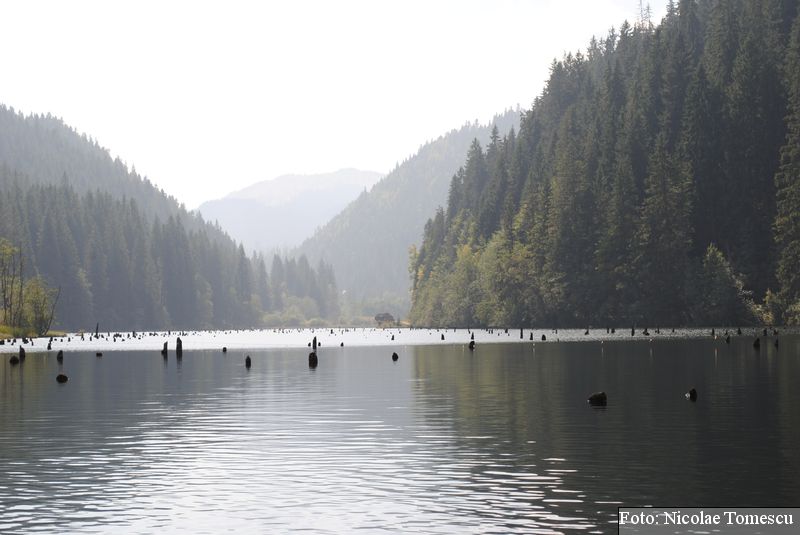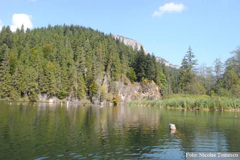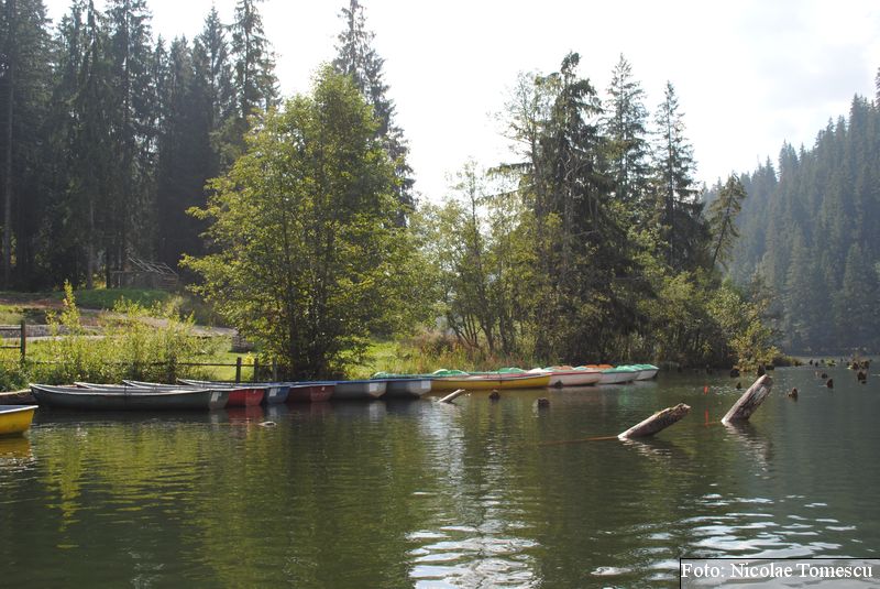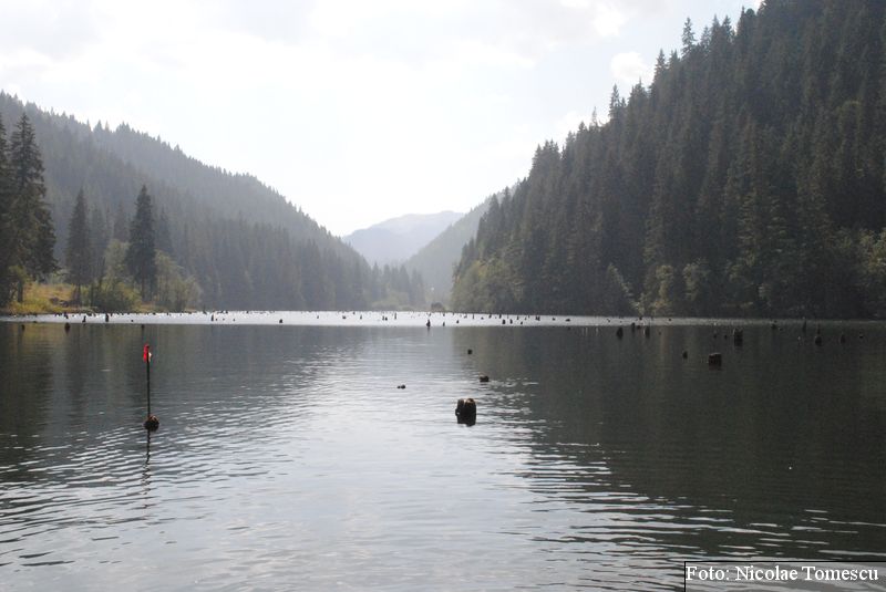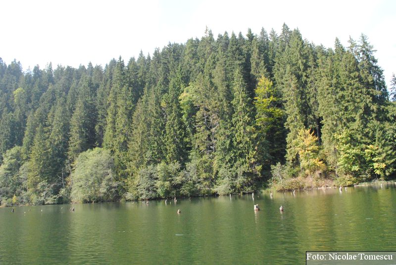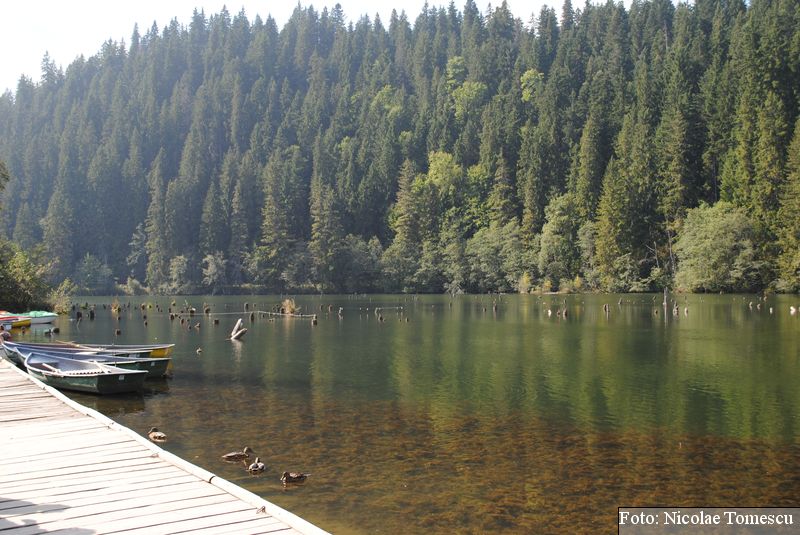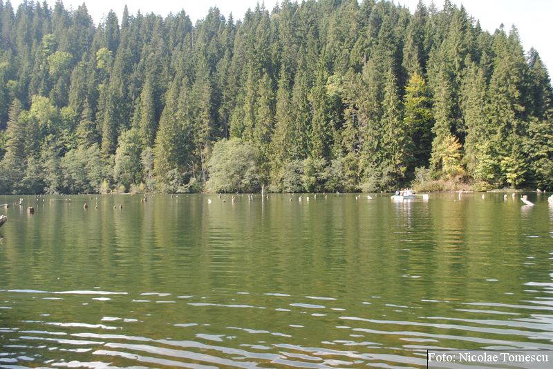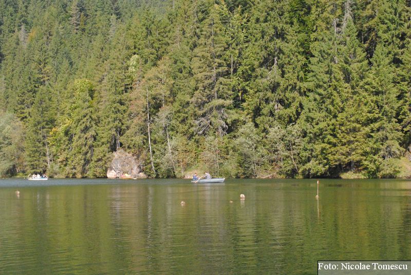 Lacul Roșu, cel mai mare lac natural montan din România, se hrănește cu traiectoria Pârăului Roșu (traversează straturi de culoarea oxizilor și hidroxizilor din fier). L-am privit ca pe un miracol, nu ca pe ceva întunecat și amenințător, iar el a renunțat la primejdia cioturilor ce ies din apă. Am pătruns, cu barca, în liniștea cârdurilor de rațe care trec nestingherite, dar, mai ales, am căutat semnele formării relativ recente, într-o zi de iulie a anului 1837; atunci, după furtuni și ploi torențiale, s-a desprins o fărâmă din Muntele Ucigașu și a împiedicat trei cursuri de apă. Reflectarea purpurie a Suhardului Mic, prezența aluviunilor roșiatice aduse, îndeosebi, de pârâul Roșu, calcarele roșcate din jurul apei i-au inspirat pe ciobani să-i dea numele de Lacul Roșu. Prin 1857, trei oameni din Gheorgheni, strânși oarecum de treburi, dar mai ales de plăcere, în sticla frumuseții muntelui și a lacului, au început să povestească, tuturor, despre locul fericirii supreme, fără să spună, nimănui, dacă ei cred că în Lacul Roșu vor ajunge, după moarte, sufletele celor evlavioși. Din acea clipă, atrași de lacul-eden, de bogăția florei și faunei (râsul, capra neagră, lupul, cerbul, mistrețul), turiștii cu sau fără de Dumnezeu străbat potecile, pădurile de conifere în amestec cu alunul sau salcia de munte (pe versanții din preajmă cresc bradul alb, paltinul și plopul de munte), se gândesc la confort, la plesniturile lemnului și cărnii încinse de grătar…