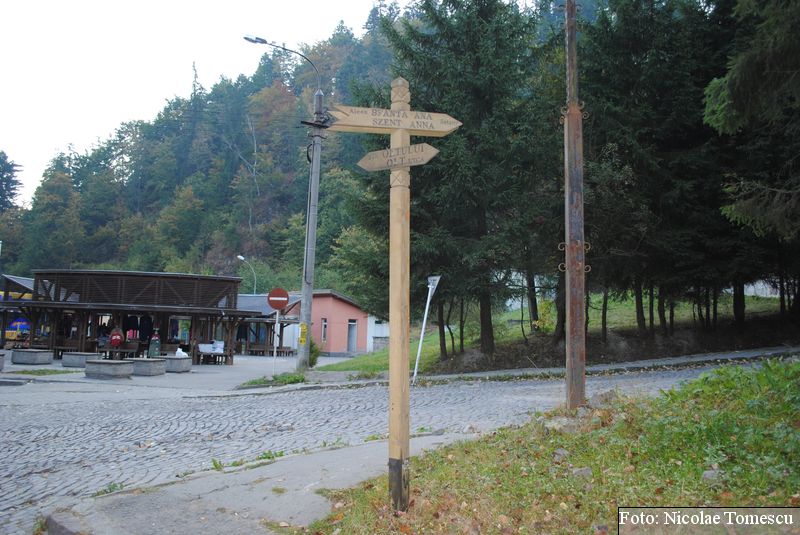 Lacul Sfânta Ana este un lac vulcanic, singurul de pe întreg teritoriul României. Așezat în adâncul craterului unui vulcan stins, denumit Ciomatu (sau Ciomadu), din masivul Puciosu, locul celei mai recente (câteva zeci de mii de ani) erupții vulcanice în Carpați și în Europa de Est, se află la o altitudine de 946 m. Această paletă de pictor își completează apele numai din precipitații, neavând izvoare; puritatea se apropie de aceea a apei distilate; în absența oxigenului, nu ne-au dezmierdat instinctele colorate ale vieții (capacitatea trofică redusă a apei lacului se datorează emanațiilor mofetice, prin fundul lacului și prin pereții craterului). Dar nici nu am avut nevoie de prognozele meteorologilor pentru a afla starea vremii; citisem despre metoda empirică, un dar oferit de alcătuirea vulcanică – prevestesc cele două fisuri formate în munte; dacă emanațiile din fisuri pișcă nasul, este semn de furtună, dacă nu te trezești înțepat de miros, ziua va fi însorită, recomandată drumețiilor; fenomenul, cu explicație științifică, privește activitatea post-vulcanică, sensibilă la orice schimbare a presiunii atmosferice – când are loc o scădere, gazele, îndeosebi bioxidul de carbon și sulful, urcă spre suprafață și inundă fisurile, semn că vine ploaia.