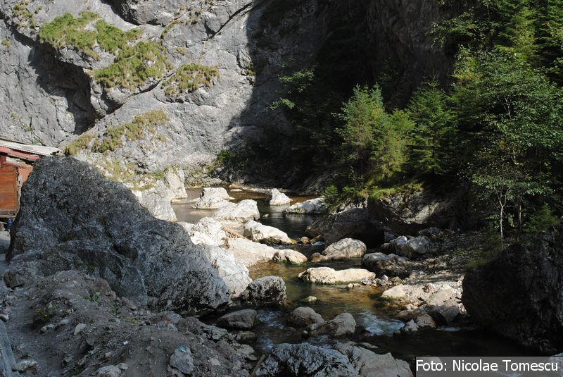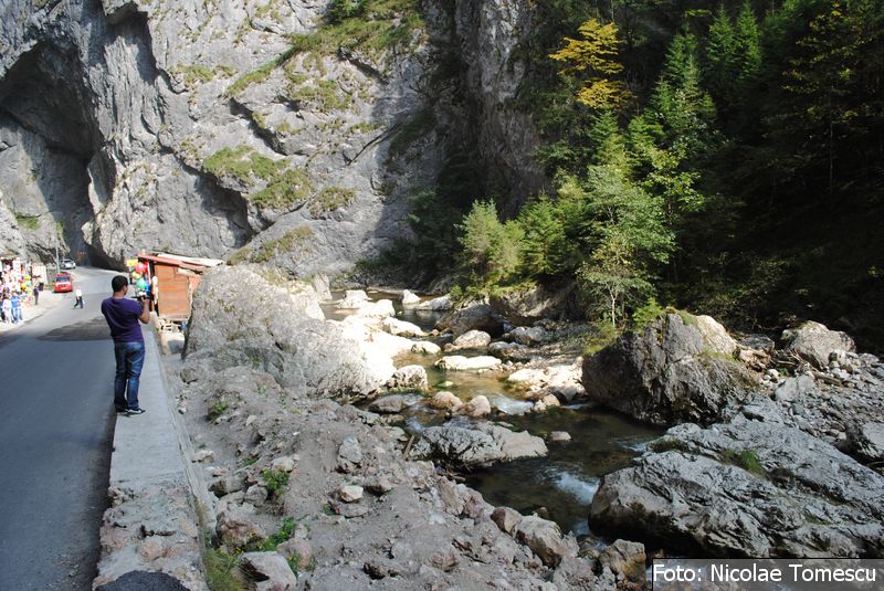 Pe valea râului Bicaz, în aval de Lacu Roșu, încep Cheile Bicazului (lungi de 8 km, de la Lacu Roșu până la Bicazul Ardelean), un fel de ascensor, cu zig-zag-uri amețitoare, care te plimbă între Transilvania și Moldova. Serpentinele din Chei nu nimeresc în mijlocul unor magazine cu produse meșteșugite în zonă, dar trec razant, lasă în urmă gesturile fixe ale obișnuinței. Pereții de calcar parcă au fost tăiați cu ferestrăul de apele repezi ale Bicazului; mai mult, ascund peșteri și avene. Ne îngăduim libertatea picăturilor de apă care desenează râurile, măreția stâncilor ne înfășoară ca și cum ar afirma rădăcinile unei lumi, iar îmbrățișările dintre om și munte țes împrejurări curate…