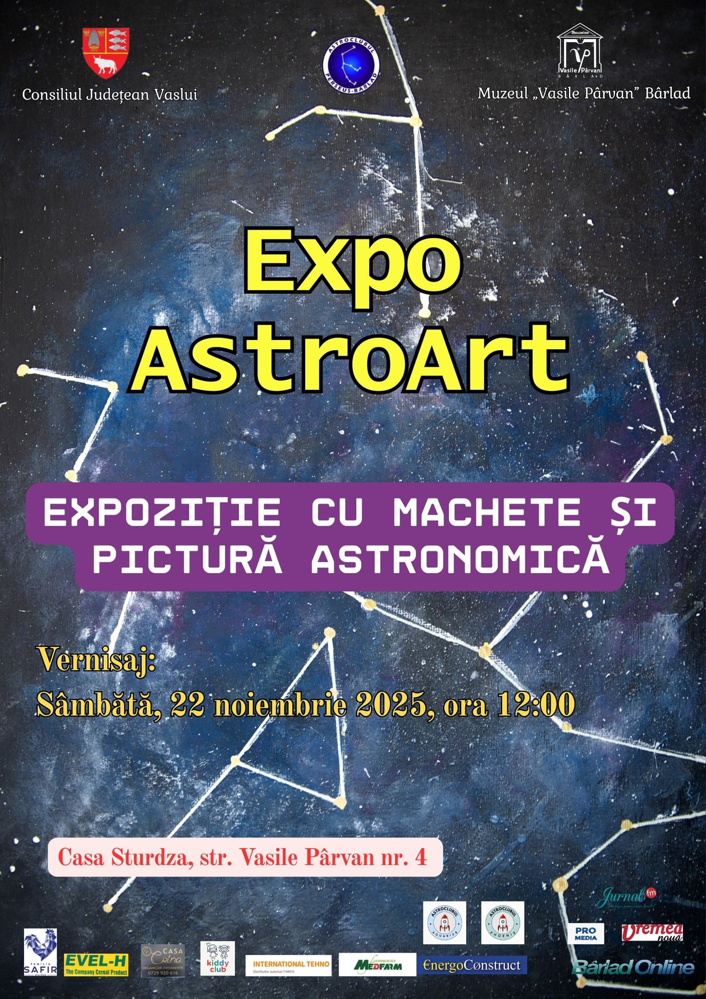 Sâmbătă, 22 noiembrie 2025, de la ora 12:00, are loc vernisajul unei expoziții inedite, AstroArt, unde arta se întâlnește cu astronomia, într-un spațiu dedicat culturii: Casa Sturdza, parte a Muzeului „Vasile Pârvan” Bârlad (str. Vasile Pârvan nr. 4).