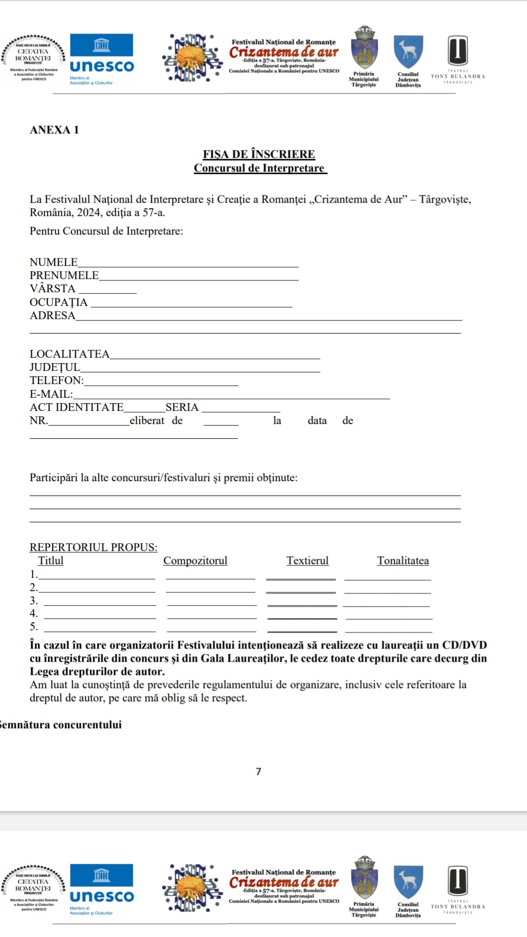 Documentele de înscriere și romanțele în primă audiție trebuie trimise până la data de 20 iunie 2024, conform Regulamentului oficial al festivalului.
