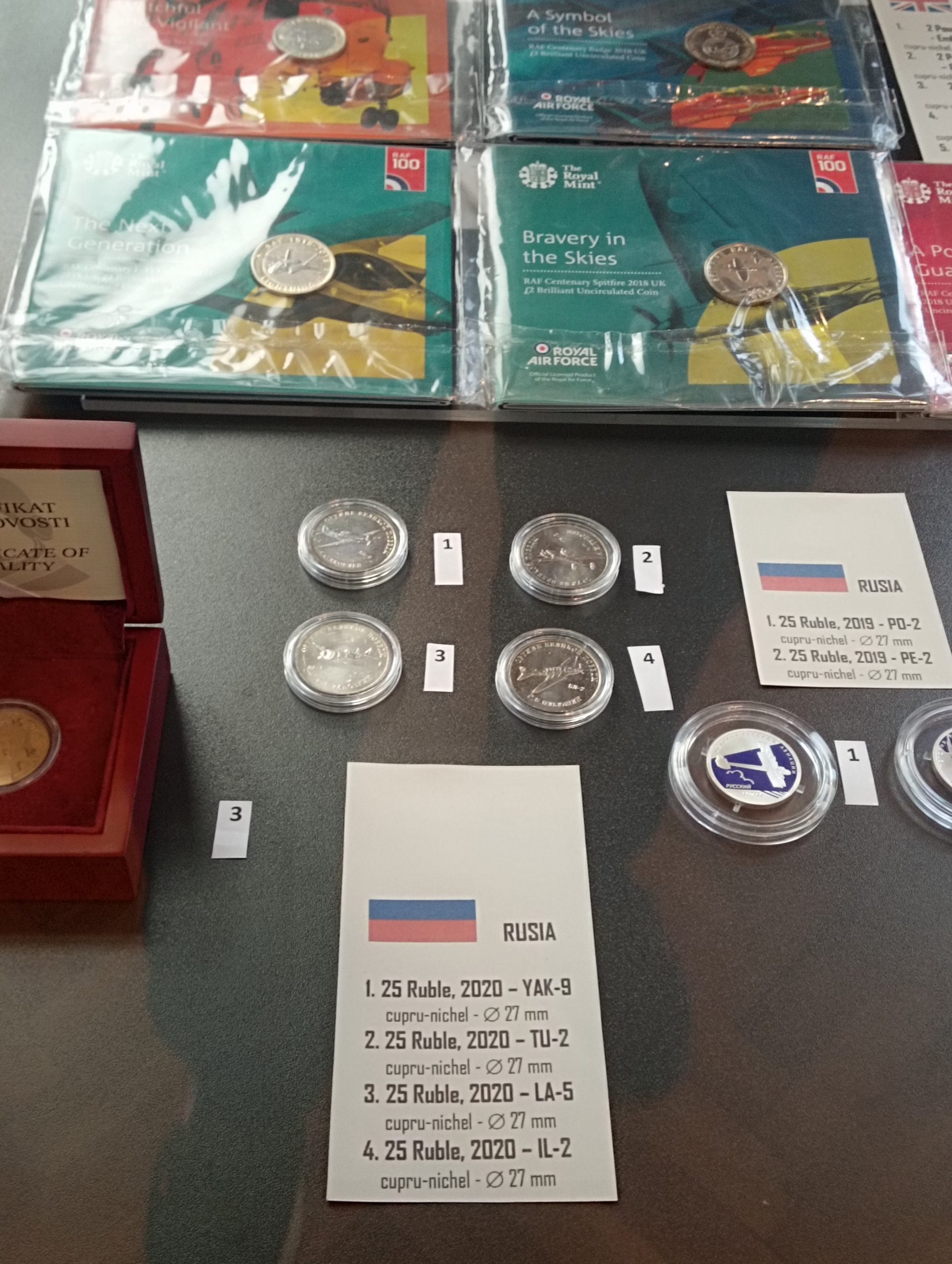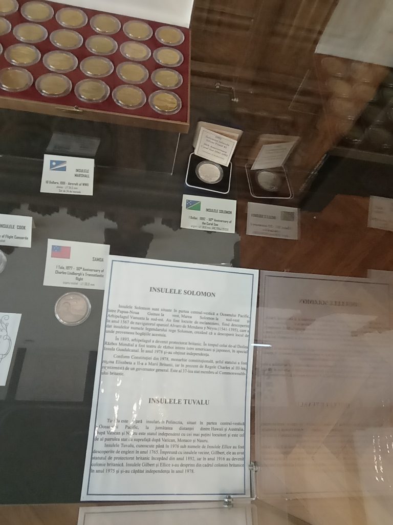Acestea aparțin colecției particulare a domnului Ovidiu Marinescu, membru SNR – Secția Bârlad. Ponderea este deținută de monede (260), realizate din aur, argint, cupru-nichel, nichel-argint, aliaj de zinc, aluminiu-bronz etc., fiecare dintre acestea surprinzând prin formă (discoidală, ovală, hexagonală sau pătrată), elemente grafice deosebite, tehnologiile de fabricație pentru realizarea portretelor monetare, forma de prezentare, precum și prin locul în care au fost emise unele dintre ele: Insulele Nauru, Niue, Tuvalu, Jersey, Turks și Caicos, Solomon, Marshall etc.