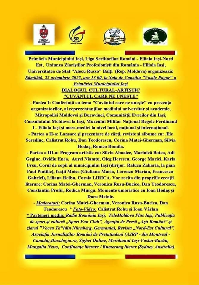 Sâmbătă, 22 octombrie 2022, în  Sala de Consiliu „Vasile Pogor” de la Palatul Roznovanu Iași, în organizarea Primăriei Municipiului Iaşi, a Ligii Scriitorilor Români – Filiala Iaşi-Nord Est, a Uniunii Ziariştilor Profesionişti din România – Filiala Iaşi, în parteneriat cu Universitatea de Stat „Alecu Russo” din Bălţi  (Republica Moldova)  , a avut loc Dialogul Cultural sub titlul „CUVÂNTUL CARE NE UNEŞTE”.
