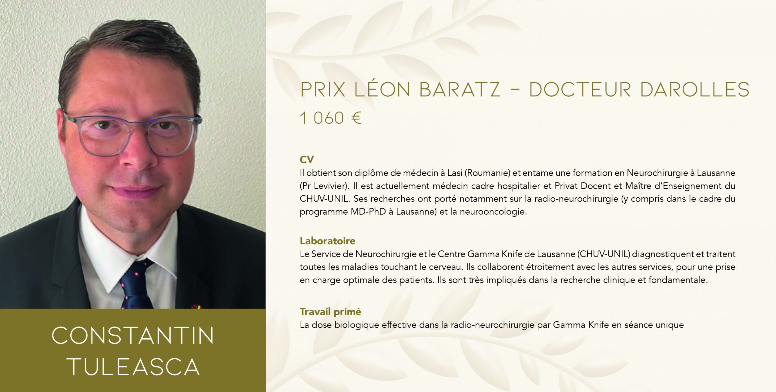 Neurochirurgul ieșean Constantin Tuleaşcă, singurul român premiat de două ori în Franța, este absolvent al Universităţii de Medicină şi Farmacie „Grigore T. Popa“ din Iaşi.