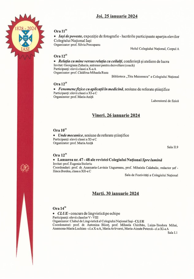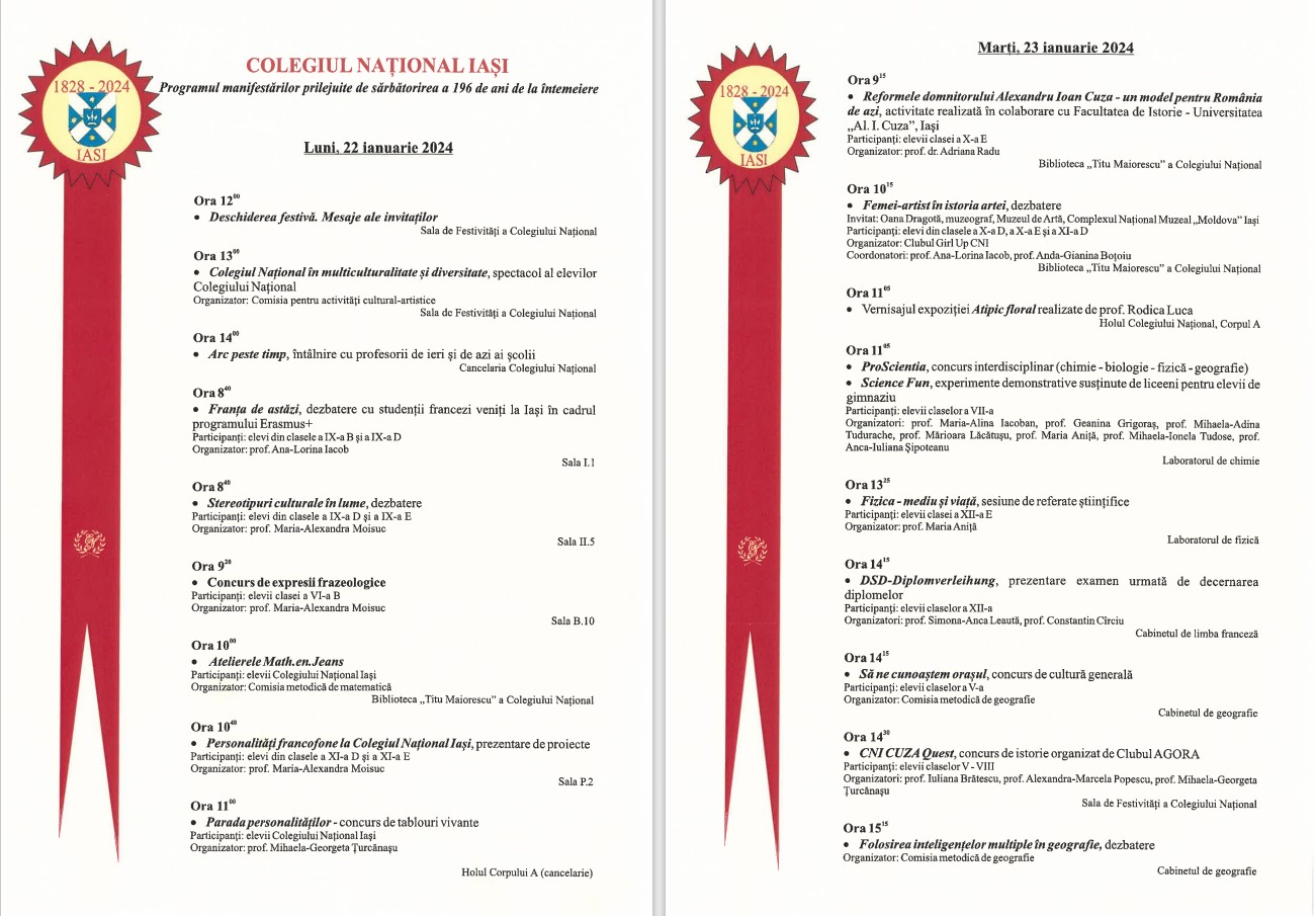 Programul activităților zilelor ”Colegiului Național” Iași: