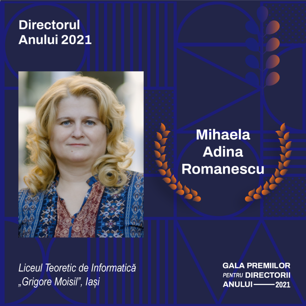 Premiile au fost câștigate de patru lideri educaționali din Iași, Tecuci, Târgu Măgurele și Pașcani. Directorul Anului 2021 este Adina Mihaela Romanescu, director la Liceul Teoretic de Informatică ”Grigore Moisil” din Iași.