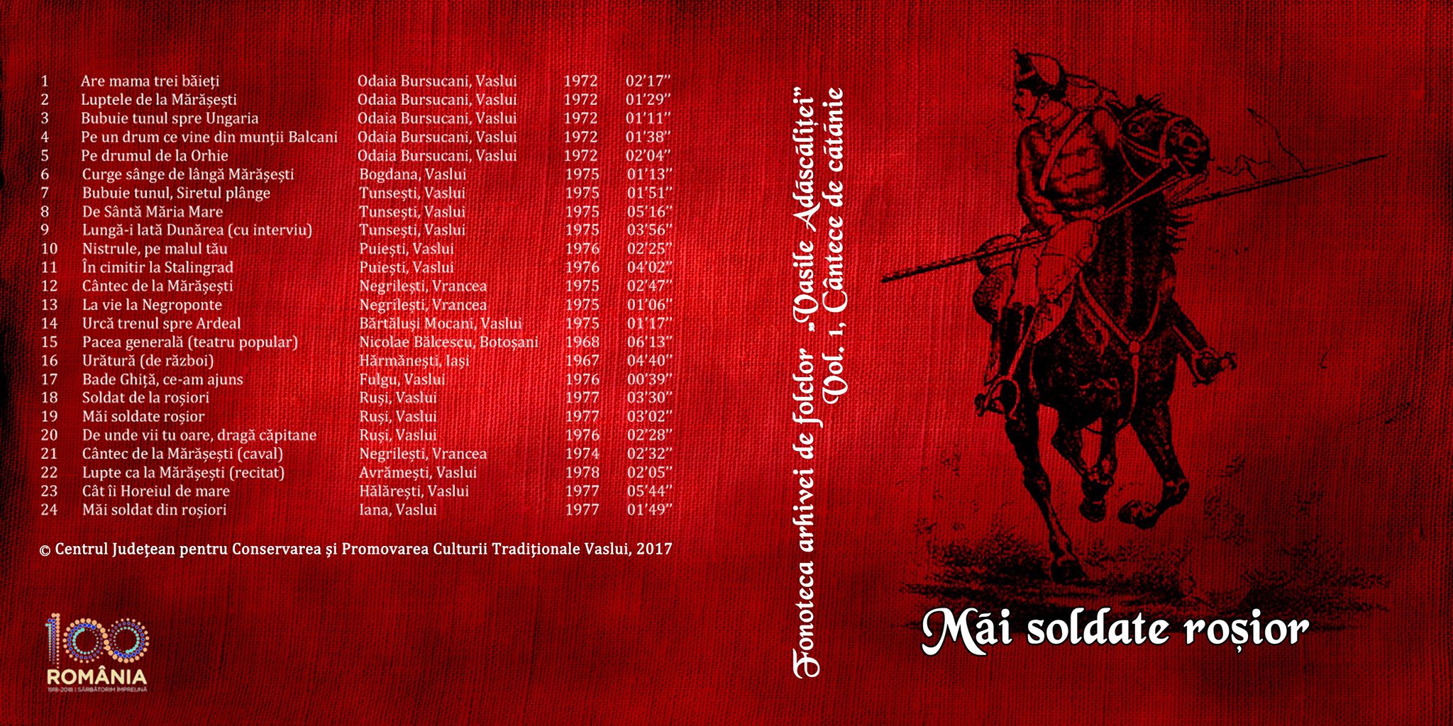De la etnolog Lucian-Valeriu Lefter, din prima intervenție audio pe care o difuzăm, aflăm detalii despre cuprinsul primului volum – Măi soldate roșior, volum însoțit de un Compact Disk pe care sunt 24 de piese folclorice de pe benzile din Fonoteca Arhivei de Folclor Vasile Adăscăliței.