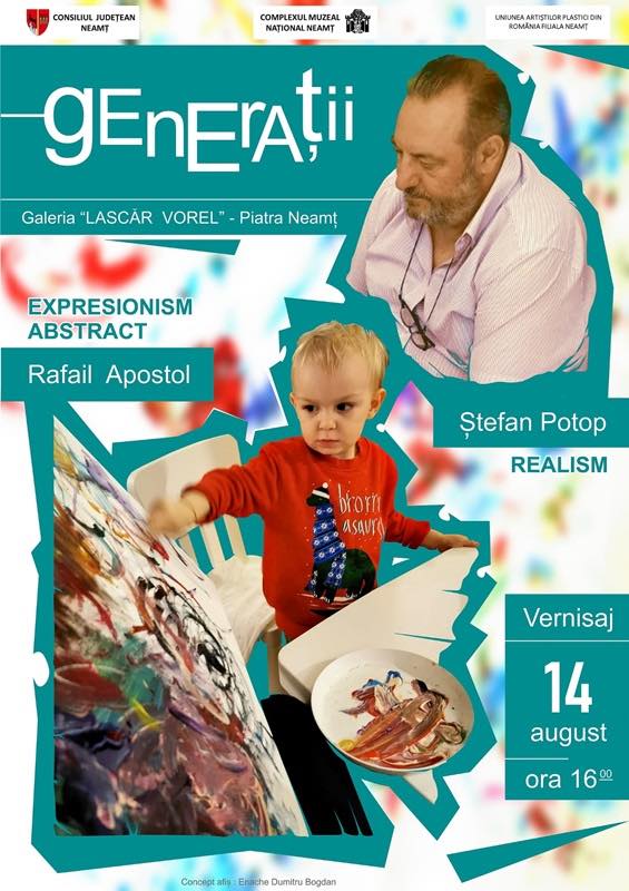 Artistul plastic Ștefan Potop expune la Galeriile de Artă „Lascăr Vorel” din Piatra Neamț alături de nepotul său de aproape trei ani, Rafail Apostol. Un duet inedit, la care suntem invitați să descoperim măiestria unui pictor consacrat și expresia inocenței unui mic artist debutant. Lucrările vor ramâne pe simezele nemțene până la finalul lunii august.