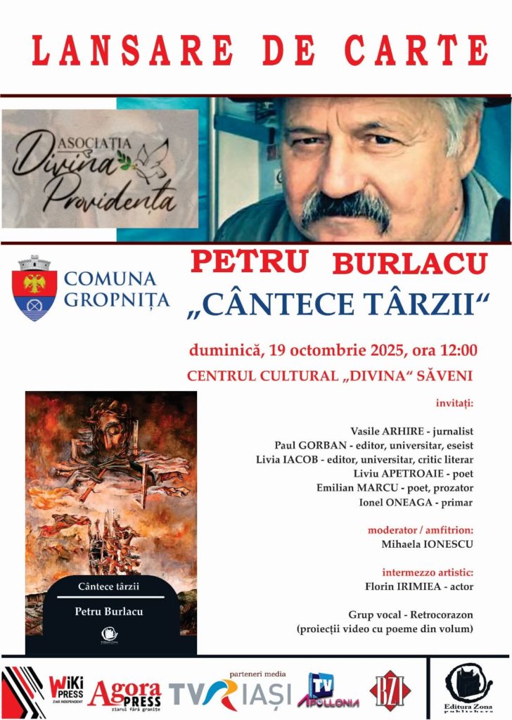 Duminică, 19 octombrie 2025, de la ora 12:00, la Centrul Asociației Divina Providența din satul Săveni, comuna Gropnița, județul Iași are loc lansarea de carte ”Cântece Târzii”, autor Petru Burlacu.