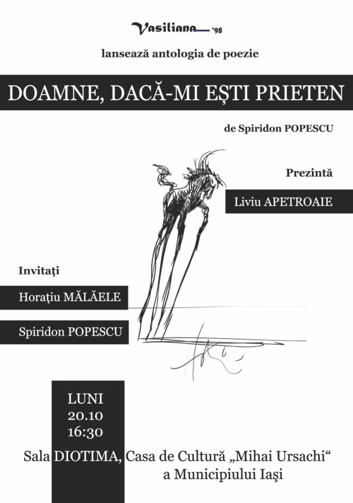 Luni, 20 octombrie 2025, începând cu ora 16:30, la Iași, în Sala „Diotima” din incinta Casei de Cultură „Mihai Ursachi” (Parcul Copou) reprezentanții Editurii Vasiliana 98 vor lansa antologia de poezie DOAMNE, DACĂ-MI EȘTI PRIETEN.