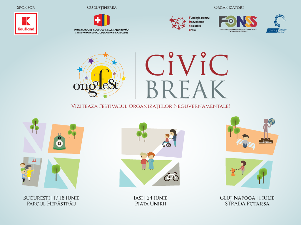 În 24 iunie 2017, în Gradina Palas, peste 50 de ONG-uri din toate domeniile (asociatii, fundatii, cooperative, case de ajutor reciproc (CAR-uri, CARP-uri), grupuri civice neinregistrate, cu sediul in Romania) vă invită la un Civic Break-ul ONG Fest Iași– un eveniment prin care se revigorează implicarea fiecărui cetățean și se face o excursie printre cauzele prezentate în cadrul festivalului.