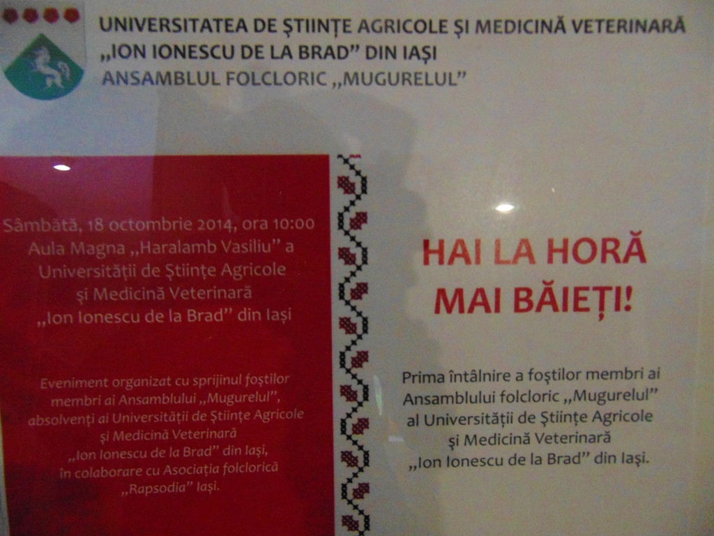 Sâmbătă, 18 octombrie 2014, Universitatea de Ştiinţe Agricole şi Medicină Veterinară “Ion Ionescu de la Brad” din Iaşi (UŞAMV) a fost gazda unui eveniment folcloric remarcabil. În Aula Magna, a avut loc prima întâlnire a foştilor membri ai Ansamblului folcloric “Mugurelul” cu membrii actualului ansamblu “MUGURELUL NOU” al UŞAMV Iaşi, în cadrul spectacolului folcloric denumit “HAI LA HORĂ MĂI BĂIEŢI!”.
