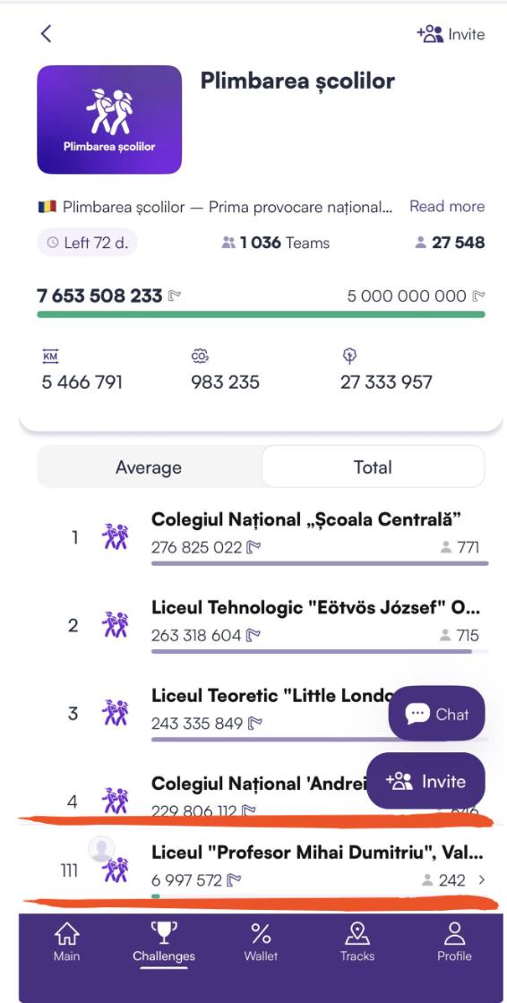Fiecare pas înregistrat în aplicație se adaugă la totalul școlii. Cu cât suntem mai mulți implicați, cu atât rezultatul reflectă mai bine efortul nostru, al tuturor.