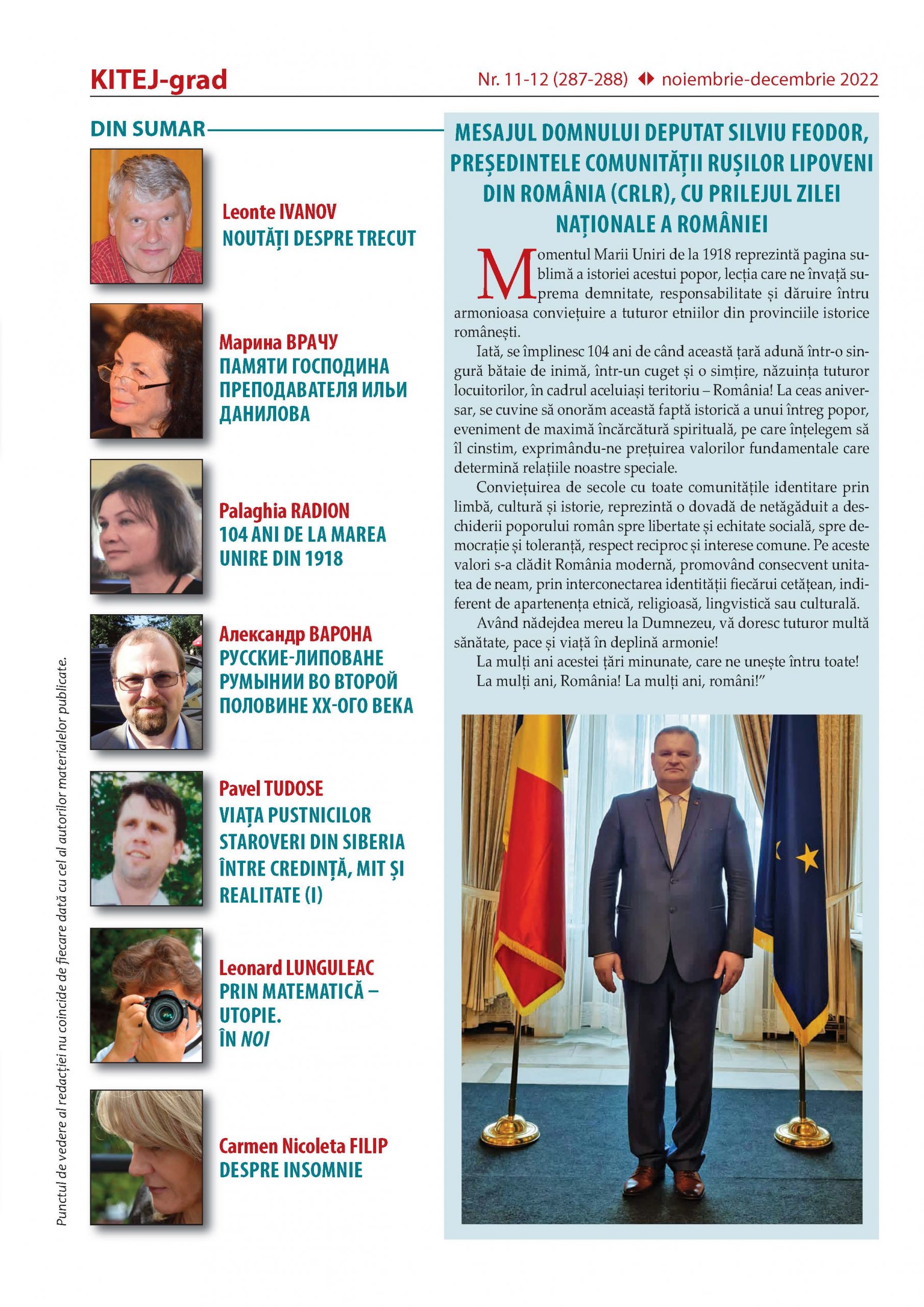 Mai târziu, în emisiunea noastră, povestim legenda cetății Kitej însă, până atunci, nu ne rămâne decât să începem dialogul cu Leonard Lunguleac, cel care ne vorbește despre atribuțiile pe care le are în ceea ce privește apariția periodicului, cu accent pe numele semnatarilor textelor din paginile revistei; interesant este că publicarea revistei este constantă, ceea ce arată durabilitatea actului cultural în sânul Comunității Rușilor Lipoveni din România.
