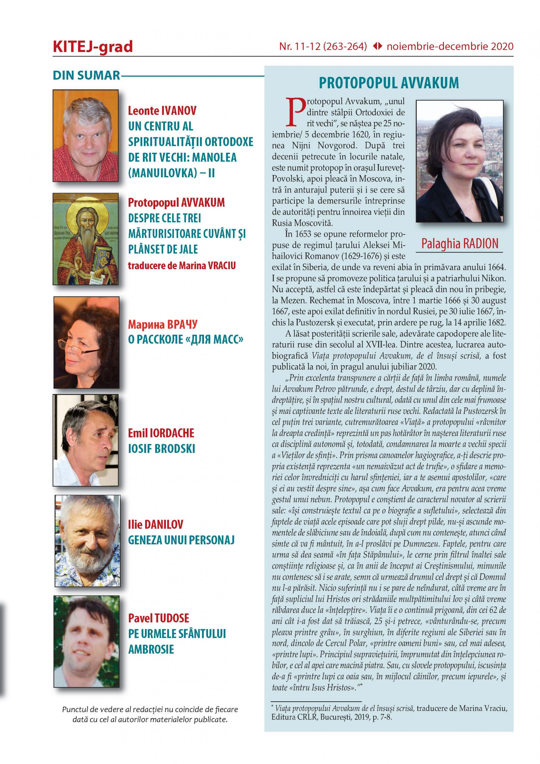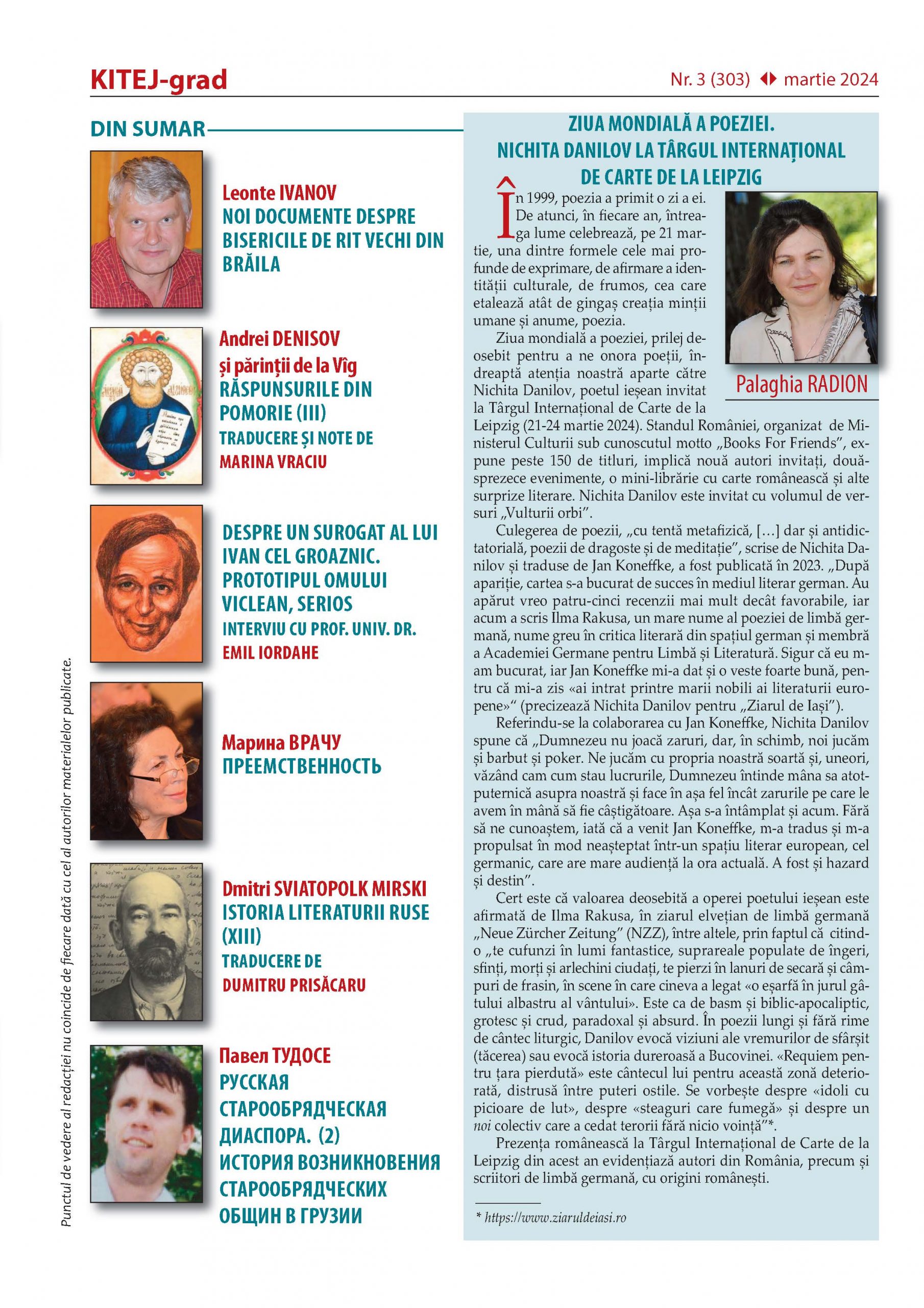 Avem în fața ochilor Numărul 200 (august 2015) al revistei „Kitej-Grad”, în paginile căruia semnează nume mari de pe tărâmul slavisticii din țara noastră: Leonte Ivanov, Marina Vraciu, Pavel Tudose, specialiști în Filologie. Alături de mesajele adresate colegiului de redacție, cu prilejul editării Numărului 200, de către conducerea Comunității Rușilor Lipoveni din România, în paginile acestui număr găsim un text semnat de către regretatul dascăl, specialist în Filologie, Ilie Danilov, în conținutul căruia citim: Grupul celor patru „vinovați” adică Petru Ivanof, Emil Iordache, Leonte Ivanov și cu mine ne-am adunat la Catedra de Slavistică pentru a pune la punct toate detaliile legate de apariția revistei. Am căzut de acord asupra numărului de pagini, am convenit că din cele douăsprezece pe care ne angajăm să le realizăm, doar patru să fie în rusă, iar celelalte în limba română. Rămânea doar să stabilim numele revistei. Emil Iordache, Dumnezeu să-l odihnească, propusese „Vostok”. Am sărit ca ars: prea semăna cu denumirile unui program spatial al fostei URSS. Noi aveam nevoie de un nume metaforă, de ceva care să șocheze dar, în același timp, să incite la meditație. Pentru că revista trebuia să poarte un nume, el a izvorât din legendă și a fost… „Kitej-Grad”.