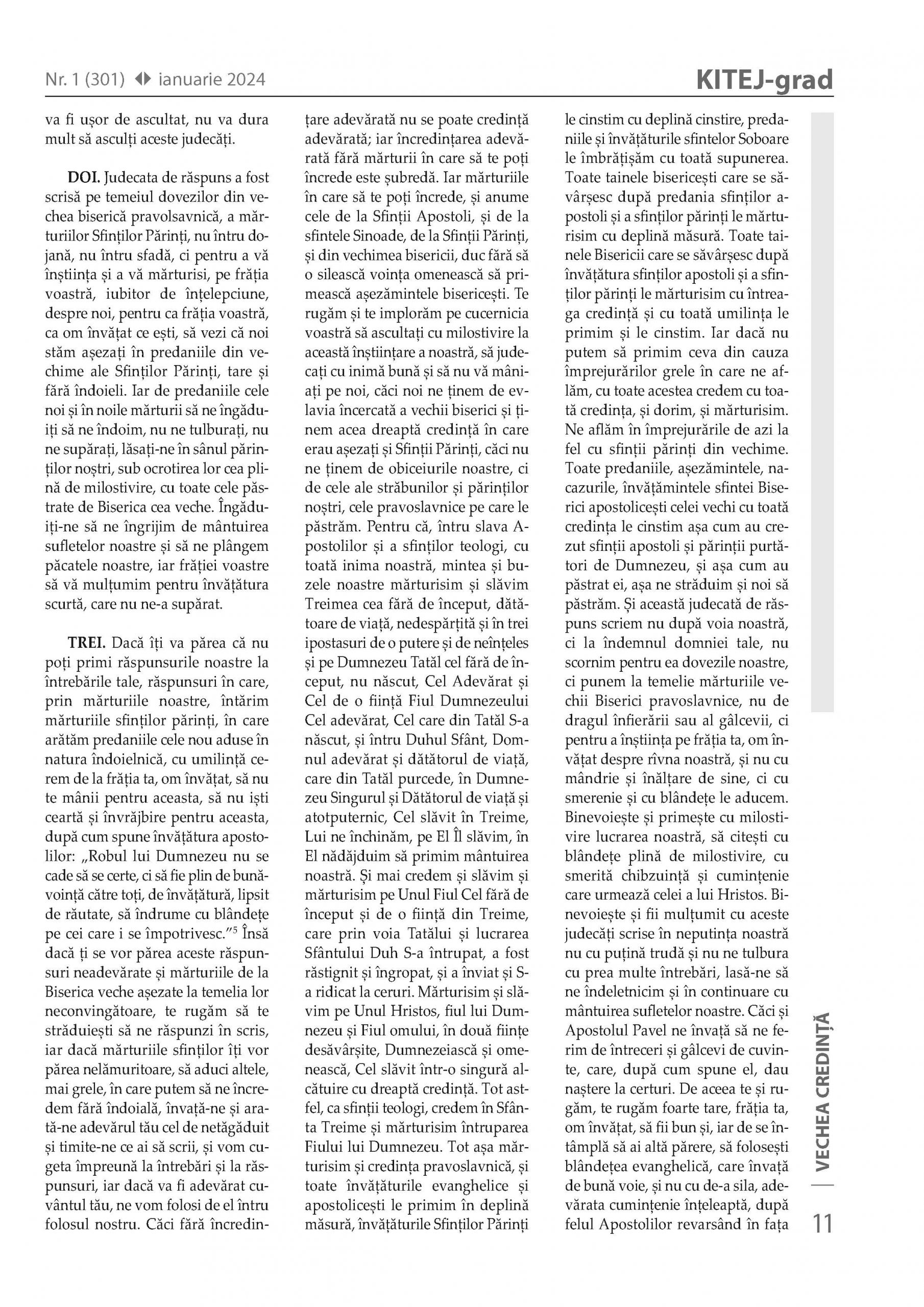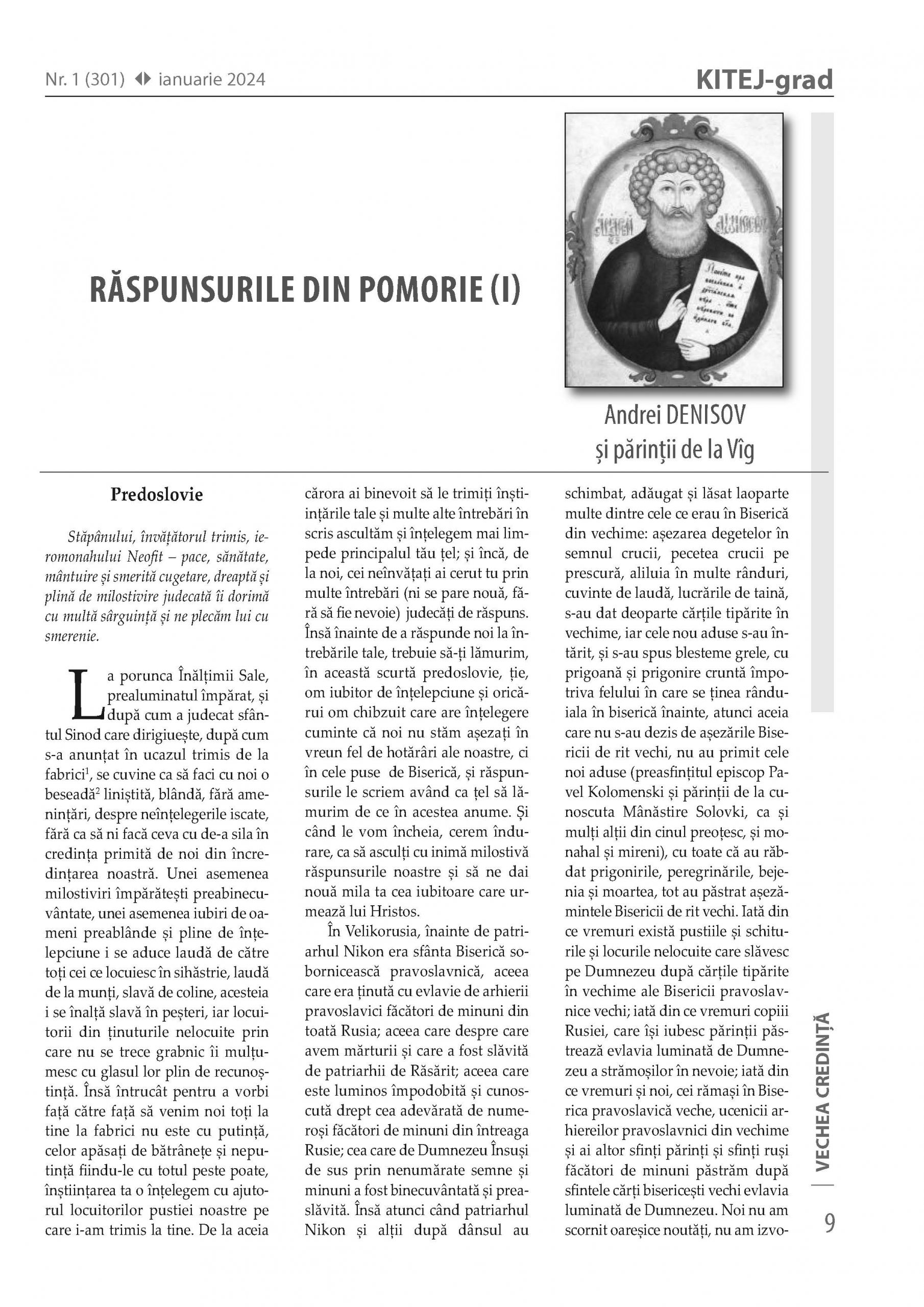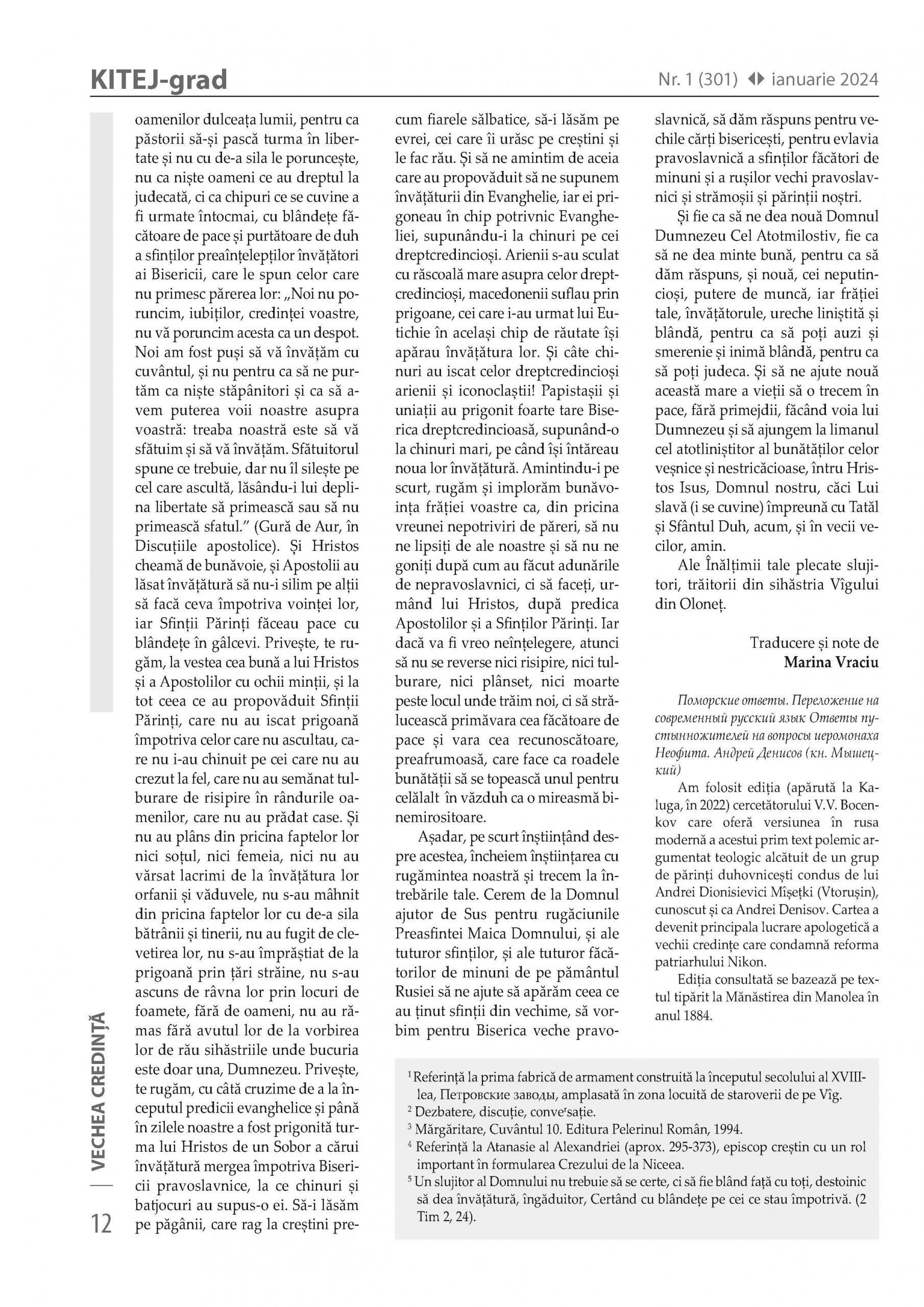 O temă pe care, în exclusivitate, doamna profesor ne-o traduce și care este surprinsă în paginile revistei „Kitej-Grad” se referă la Răspunsurile din Pomorie, „considerată o lucrare colectivă, Răspunsurile au fost elaborate în general de Andrei Denisov, scriitor, întemeietorul Pustiei de la Vîg. Este o prezentare a doctrinei credincioșilor de rit vechi în forma unor răspunsuri la 106 de întrebări prezentate în scris. Se prezintă aici principalele puncte de disensiune între staroveri și biserica oficială: semnul crucii, numărul de Aliluia, reprezentarea crucii, jertfa pâinii și a vinului, scrierea numelui Mântuitorului, formularea Simbolului credinței și altele. Unul din punctele discutate se referă la reprezentarea icoanelor. Lucrarea există în manuscris, în volum de 366 de pagini”. Despre toate acestea, invitatul ediției de astăzi doar ne amintește și, poate, în următoarea perioadă, doamna profesor ne va oferi mai multe detalii.