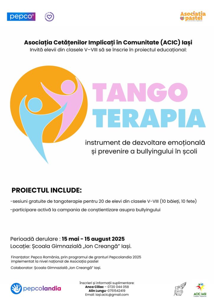 Inițiativa își propune: • Organizarea unor sesiuni gratuite de tangoterapie pentru un grup de 20 de elevi ai Școlii Gimnaziale „Ion Creangă” din Iași. • Derularea unei campanii de conștientizare a fenomenului de bullying, prin mijloace artistice și creative: tango stradal, flash-mob-uri și spectacole. Proiectul dorește să contribuie la dezvoltarea emoțională a copiilor și la consolidarea unui climat educațional bazat pe empatie, colaborare și respect reciproc, oferind o alternativă inedită și artistică de abordare a problematicii bullyingului în școli.