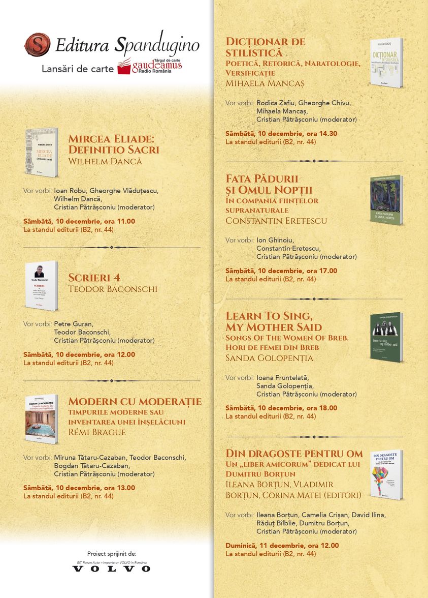 În ziua de 10 decembrie am participat, la standul Editurii Spandugino, la prezentarea cărților : Mircea Eliade: Definitio sacri, de Wilhelm Dancă; Scrieri 4. Darul desăvârșit & Cetatea sub asediu & Pe ce lume trăim, de Teodor Baconschi; Modern cu moderație: timpurile moderne sau inventarea unei înșelăciuni, de Rémi Brague; Dicționar de stilistică. Poetică, Retorică, Naratologie, Versificație, de Mihaela Mancaș; Fata Pădurii și Omul Nopții. În compania ființelor supranaturale, de Constantin Eretescu, respectiv – Hori de femei din Breb, de Sanda Golopenția. Despre aceasta din urmă carte, astăzi, în emisiunea noastră, aflăm amănunte concrete de la etnolog Ioana Fruntelată și de la Sanda Golopenția, specialist în etnologie la Universitatea Brown din Statele Unite ale Americii.