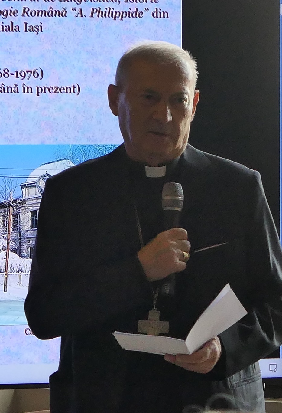 Următorul vorbitor la evenimentul de zilele trecute din incinta Sălii Voievozilor, Palatul Culturii, a fost Înalt Prea Sfinția Sa Episcopul Petru Gherghel, cel care a condus timp de peste 40 de ani Episcopia Romano-Catolică de Iași. Prea Sfințitul Petru Gherghel își începe discursul cu un verset din Sfânta Evanghelie după Matei („După roadele lor îi veţi cunoaşte”) cu trimitere la fructuoasa activitate a academicianului Ion H. Ciubotaru, amintind de prestigioasa lucrare CATOLICII DIN MOLDOVA. Universul culturii populare (3 volume), carte care a văzut lumina tiparului la Editura Presa Bună din Iași. În contextul apariției lucrării de față, Prea Sfințitul Petru Gherghel ne mai precizează că „înaintea Domnului, profesorul Ciubotaru a făcut un lucru așa de mare, încât trebuie notat și cu calitatea de lucru sfânt”. Înspre finalul discursului, Petru Gherghel transmite felicitările cuvenite academicianului Ion H. Ciubotaru, invitându-ne la respect față de tot ceea ce aparține inimii omului, inimii românului.