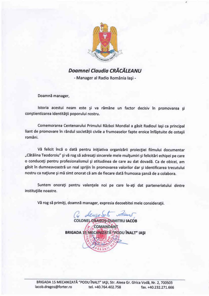 Cu prilejul Anului comemorativ „Ecaterina Teodoroiu”, la împlinirea a 100 de ani de la sacrificiul suprem al eroinei pe frontul din Moldova în Primul Război Mondial, Radio România Iași a inițiat un proiect cultural-istoric prin care se vizează creșterea gradului de cunoaștere a istoriei neamului și a înaintașilor care au luptat și care și-au dat viața pentru țară și pentru libertatea românilor.