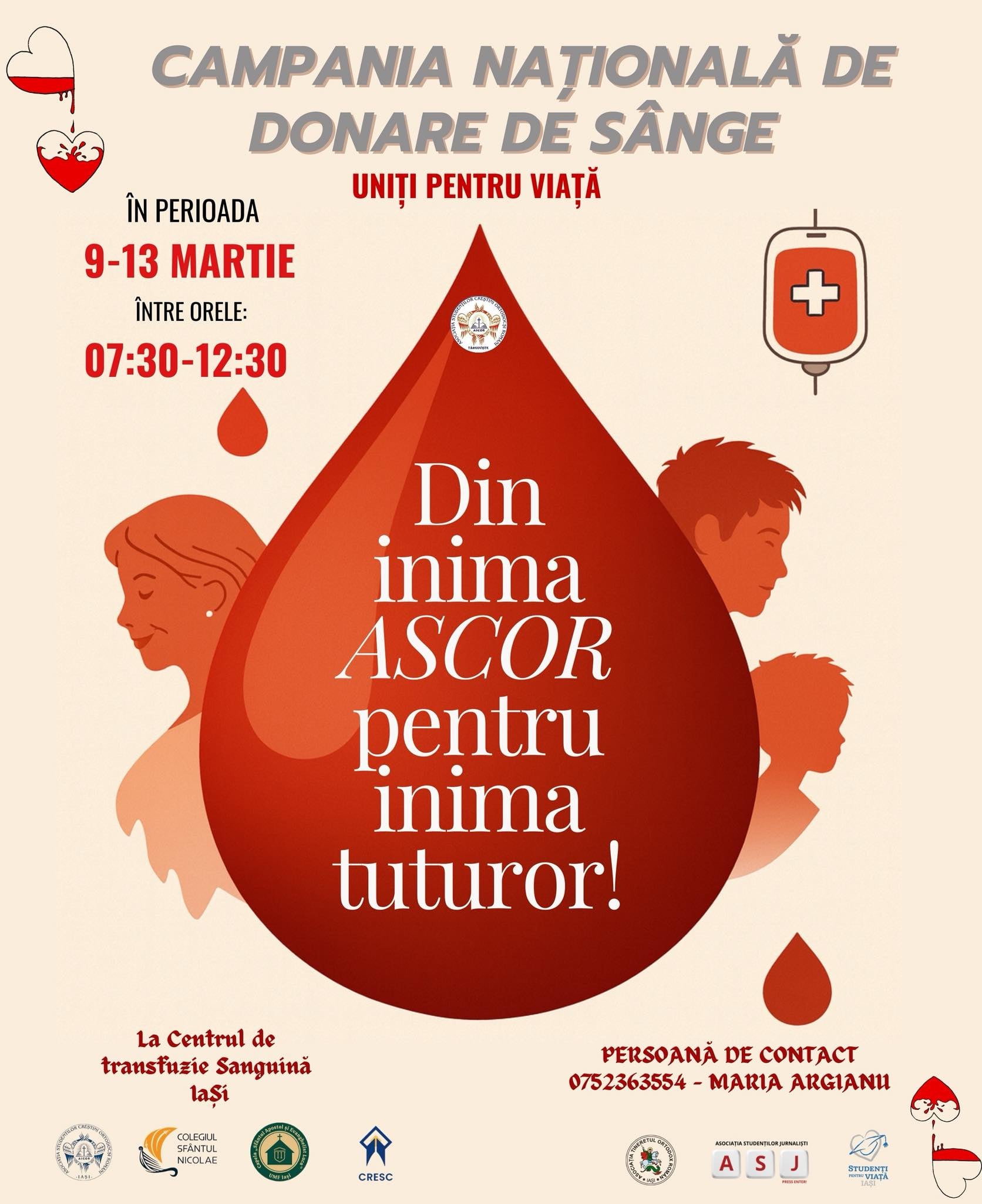 În perioada 9-13 martie 2026 va avea loc campanie de donare de sânge organizată de ASCOR Iași. Campania se desfășoară la nivel național în toate filialele ASCOR din țară.