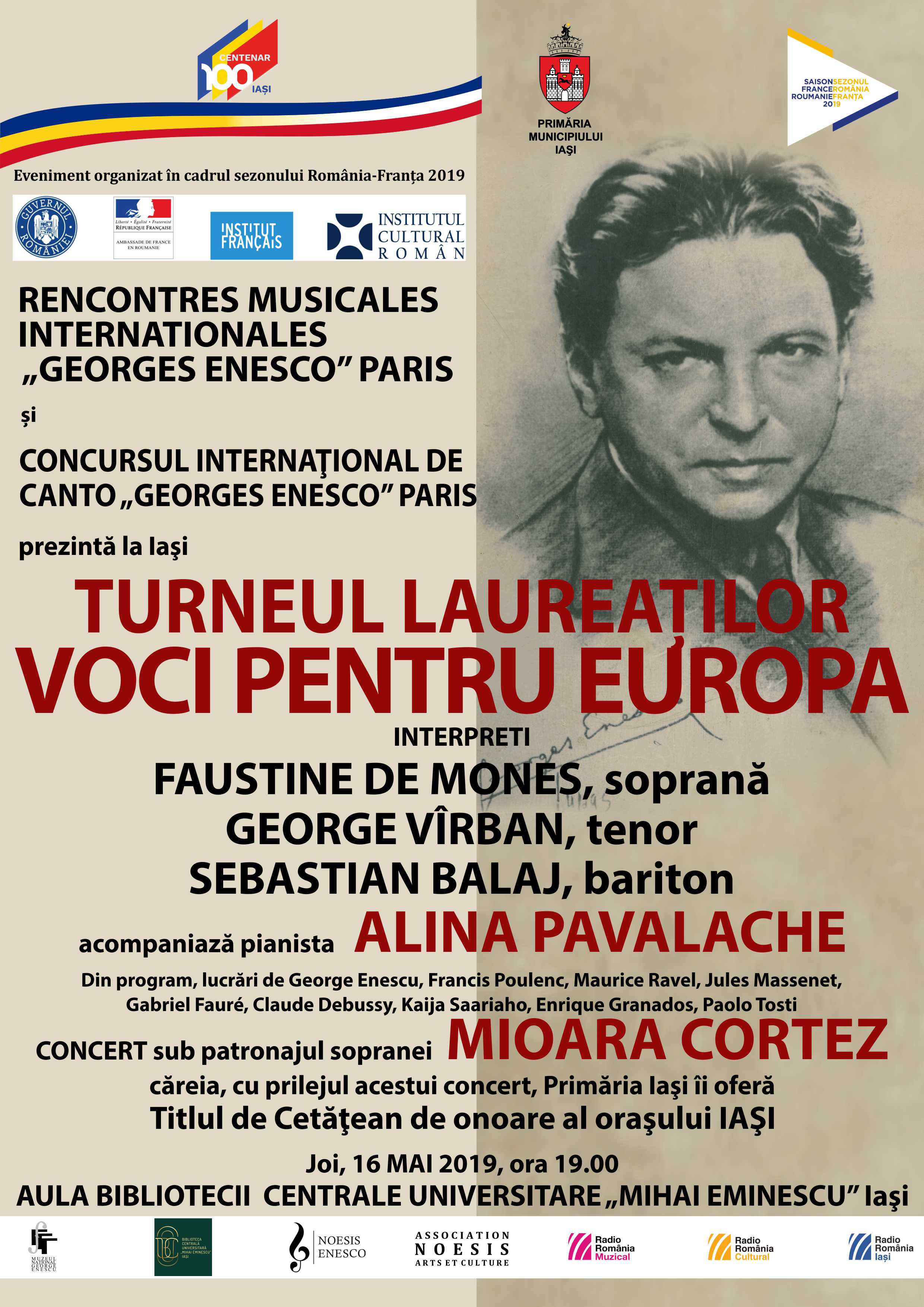 Concertul extraordinar susținut de laureații Concursului Internațional de Canto „Georges Enesco” 2018 va alea loc Joi, 16 mai, de la ora 19.00, în Aula Bibliotecii Centrale Universitare Mihai Eminescu. Concertul de la Iasi face parte din turneul „Voci pentru Europa”, organizat de Asociația Noesis-Enesco și partenerii săi în cadrul Sezonului Franța-România, dar şi în cadrul Festivalului International al Educatiei, beneficiind de susţinerea Primăriei Municipiului Iaşi şi a Institutului Francez Iaşi.