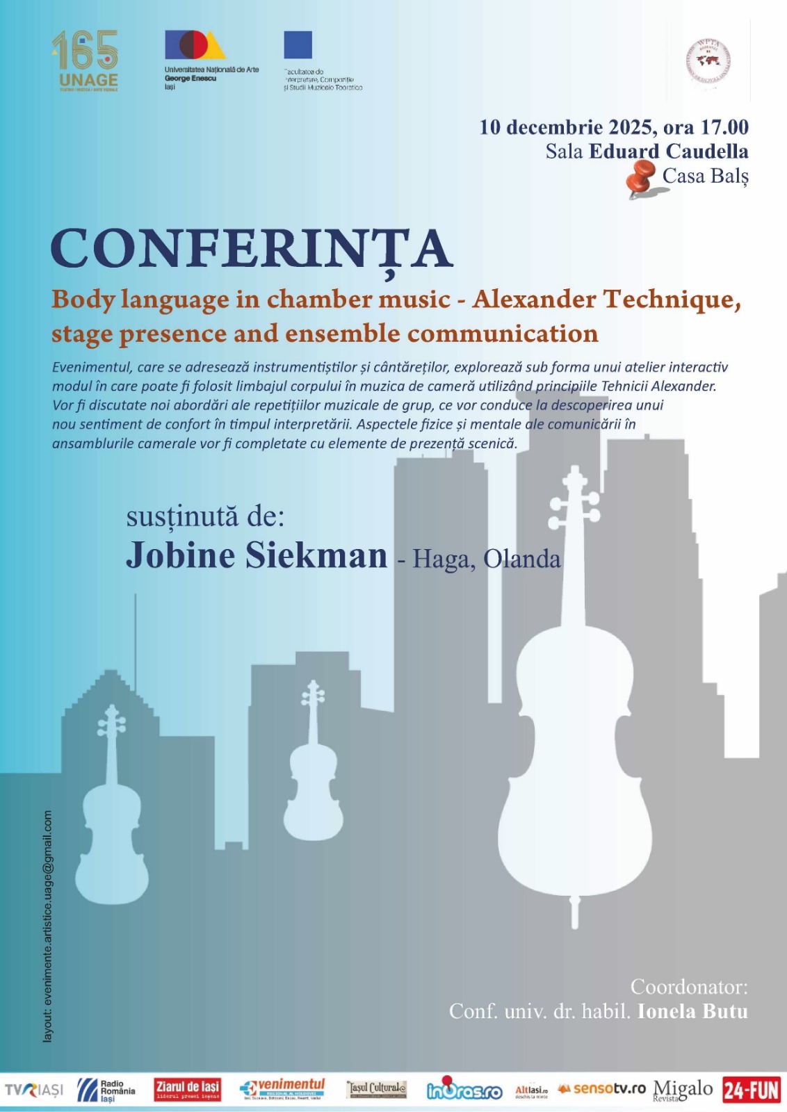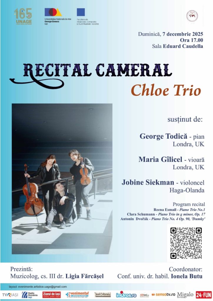 Maria Gîlicel – vioară, Jobine Siekman – violoncel și George Todică – pian au fost invitații Universității Naționale de Arte George Enescu din Iași la începutul lunii decembrie 2025, prin grija d-nei conf. univ. dr. Ionela Butu, care este invitată în emisiune și ne va povesti despre întregul proiect (vezi și afișele). Vom avea de asemenea secvențe din prezentarea recitalul Cameral din data de 7 decembrie 2025, realizată de dr. Ligia Fărcășel, muzicolog și cs III.