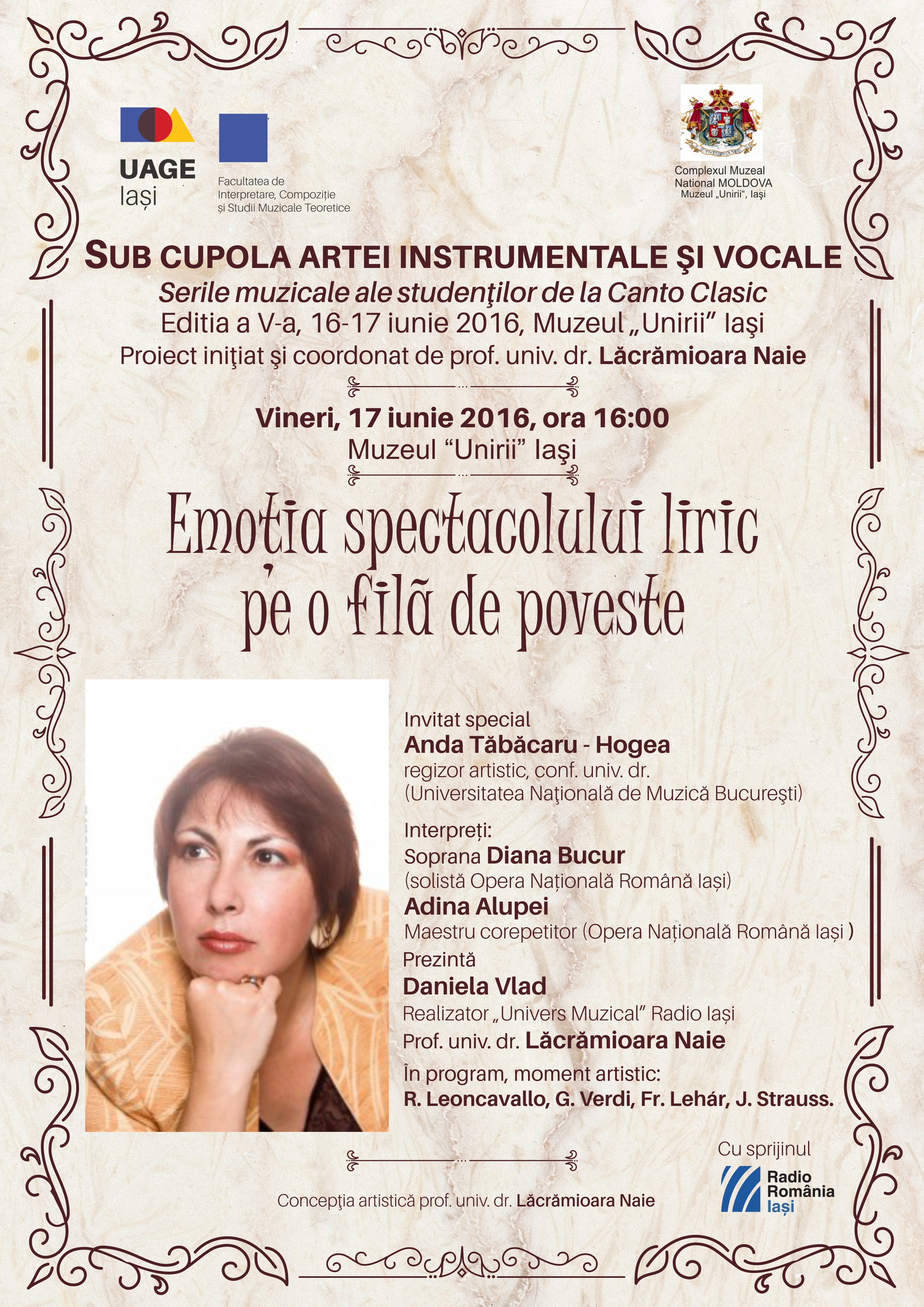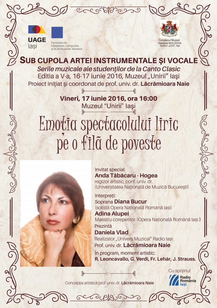 Vineri, regizor și conf. univ. dr. la Universitatea Națională de Muzică București, Anda Tăbăcaru-Hogea, va fi prezentată de Daniela Vlad, realizator de emisiuni la Radio Iași.