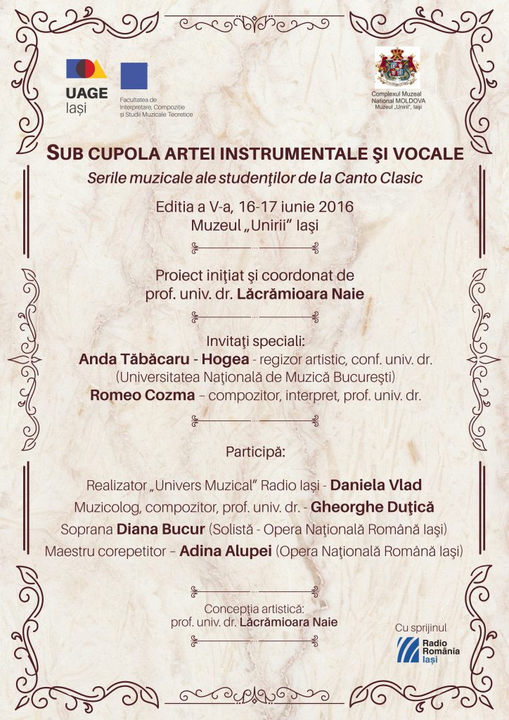 Joi, 16 și vineri, 17 iunie, de la ora 16:00, la Muzeul Unirii din Iași, au loc cele două seri ale noii ediții, a V-a, a proiectului „Sub cupola artei instrumentale si vocale”, prin care prof. univ. dr. Lăcrămioara Naie, de la Universitatea de Arte „George Enescu”, în colaborare cu Complexul Muzeal „Moldova”, propune publicului cunoașterea unor personalități prestigioase ale Iașului cultural.