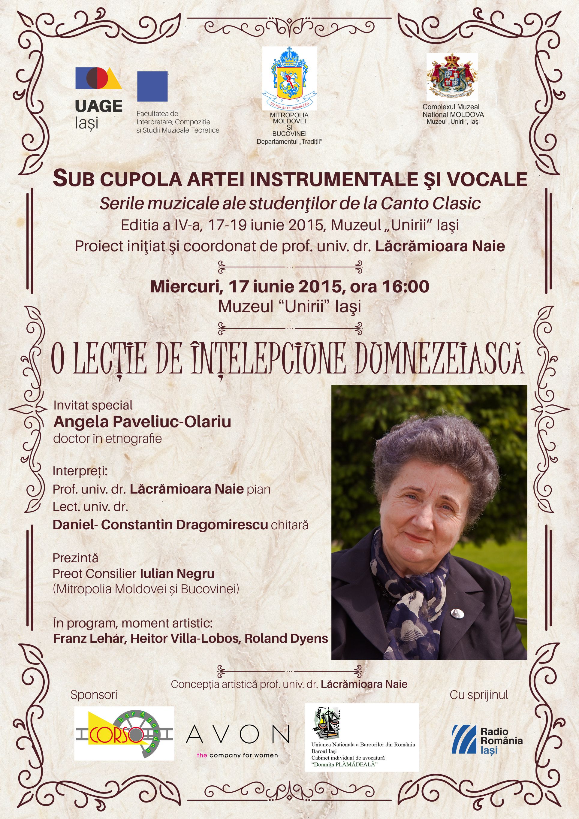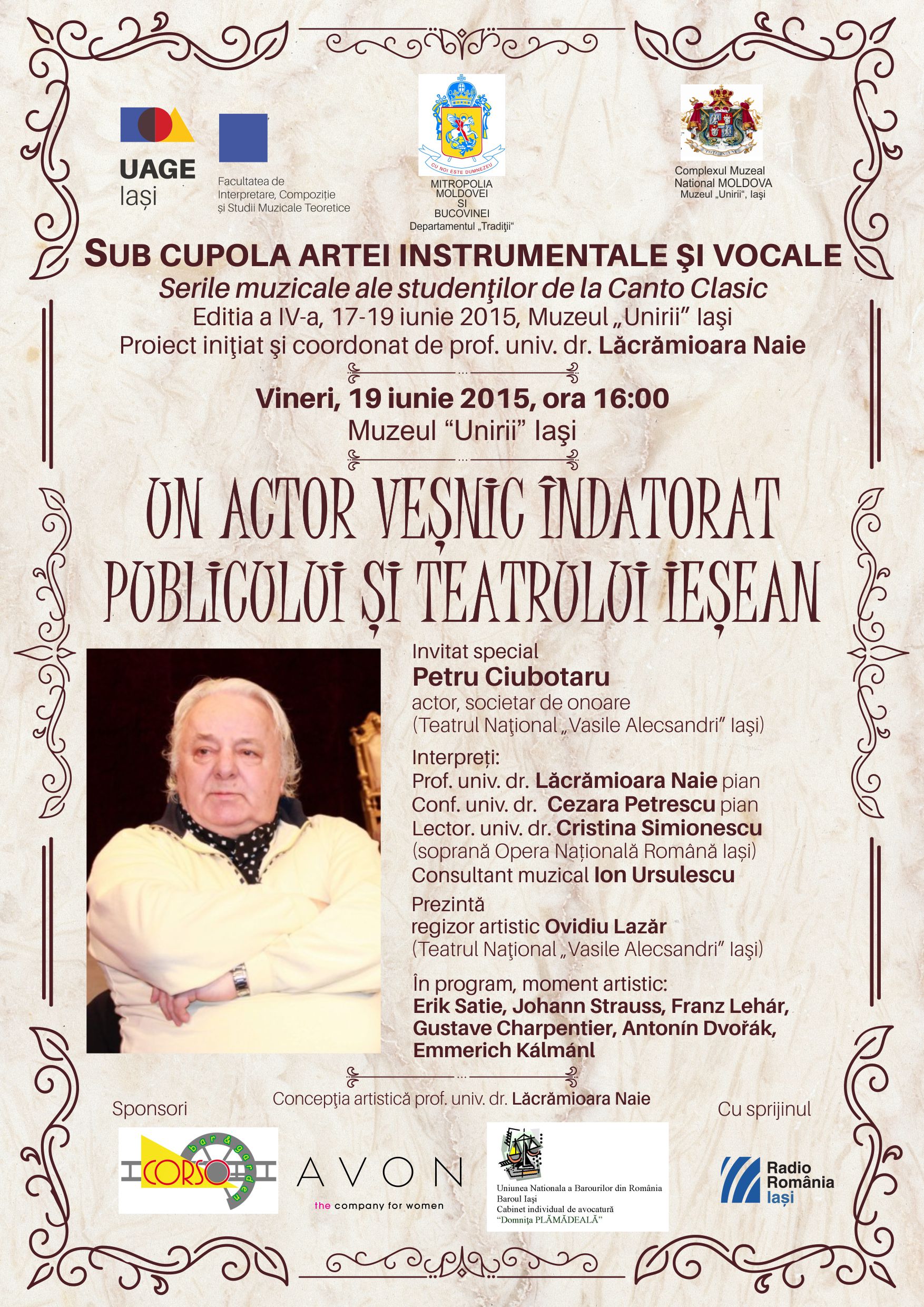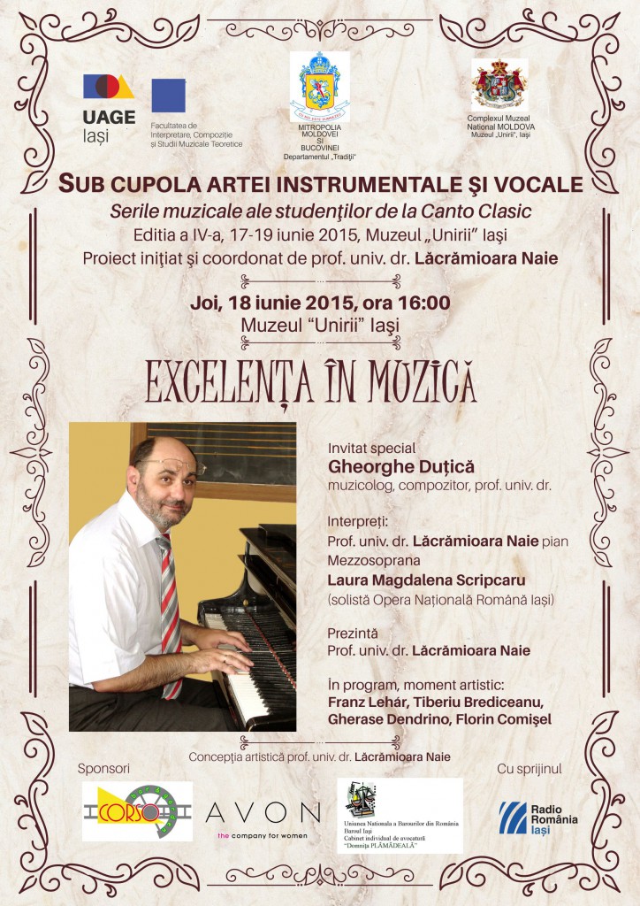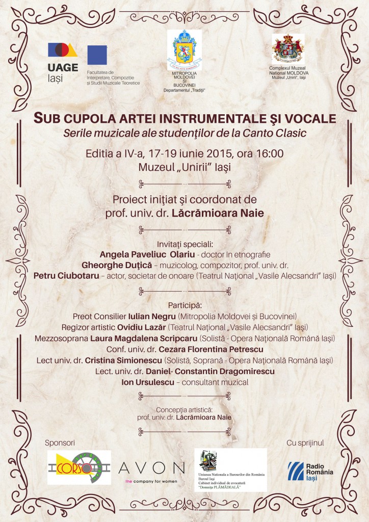 Universitatea de Arte “George Enescu” Iaşi invită pubicul în perioada 17-19 iunie 2015 la Muzeul Unirii din Iaşi, în fiecare zi de la ora 16:00, la cea de a IV-a ediţie a întâlnirilor culturale intitulate „Sub cupola artei instrumentale şi vocale”. Proiectul îmbină momente artistice camerale cu povestiri şi evocări din trecutul personalităţilor invitate: miercuri 17 iunie “Din înţelepciunea dumnezeiască”, invitată Angela Paveliuc Olariu, doctor în etnografie, prezentată de preot consilier Iulian Negru; joi 18 iunie “Excelenţa în muzică”, invitat prof.univ.dr. Gheorghe Duţică, muzicolog şi compozitor; vineri, 19 iunie “Un actor veşnic îndatorat publicului şi teatrului ieşean”, invitat Petru Ciubotaru, societar de onoare al Teatrului Naţional „Vasile Alecsandri”, prezentat de regizorul Ovidiu Lazăr, invitat de asemenea Ion Ursulescu, consultant muzical. Momentele muzicale vor fi susţinute de mezzosoprana Laura Magdalena Scripcaru şi soprana Cristina Simionescu, soliste la Opera Naţională Română Iaşi, conf.univ.dr. Cezara Florentina Petrescu – pian, prof.univ.dr. Lăcrămioara Naie – pian, lect.univ.dr. Daniel Dragomirescu – chitară. Proiectul este iniţiat şi coordonat de prof.univ.dr. Lăcrămioara Naie de la Universitatea de Arte “George Enescu” Iaşi, cu sprijinul Mitropoliei Moldovei şi Bucovinei – Departamentul Tradiţii şi Muzeului Unirii Iaşi.