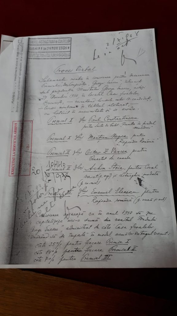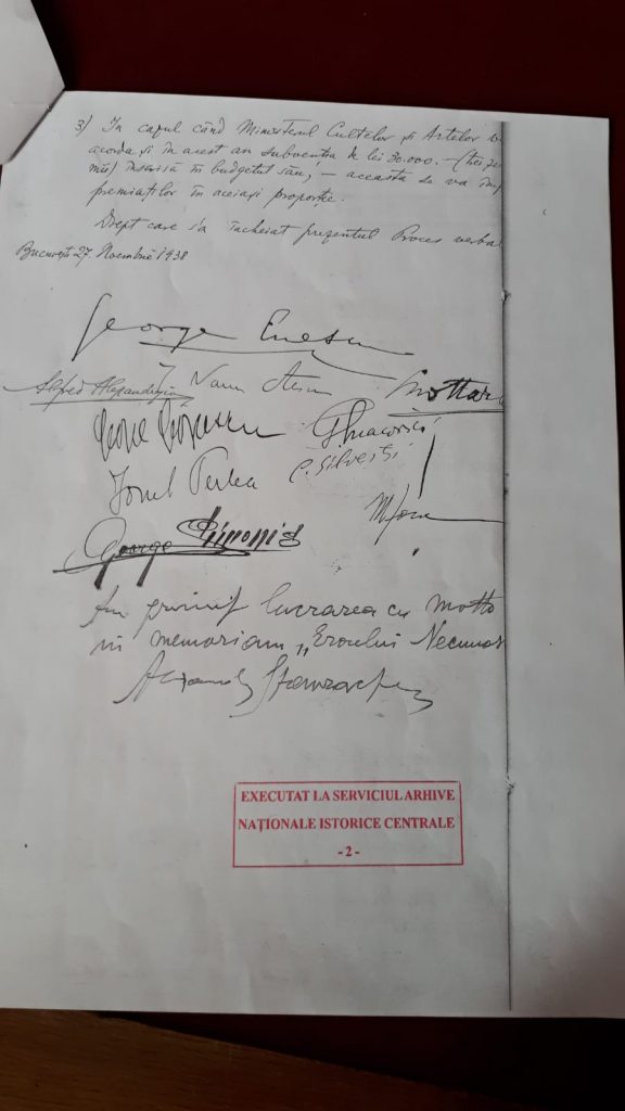 Subsemnaţii, membrii în comisiunea pentru decernarea Premiului de Compoziţie „George Enescu”, întruniţi sub prezidenţia Maestrului George Enescu, astăzi 27 noiembrie 1938, în localul Casei Şcoalelor, Bucureşti, – cercetând lucrările celor 17 candidaţi, lucrări menţionate în tabloul alăturat, am hotărât în unianimitate să se acorde: