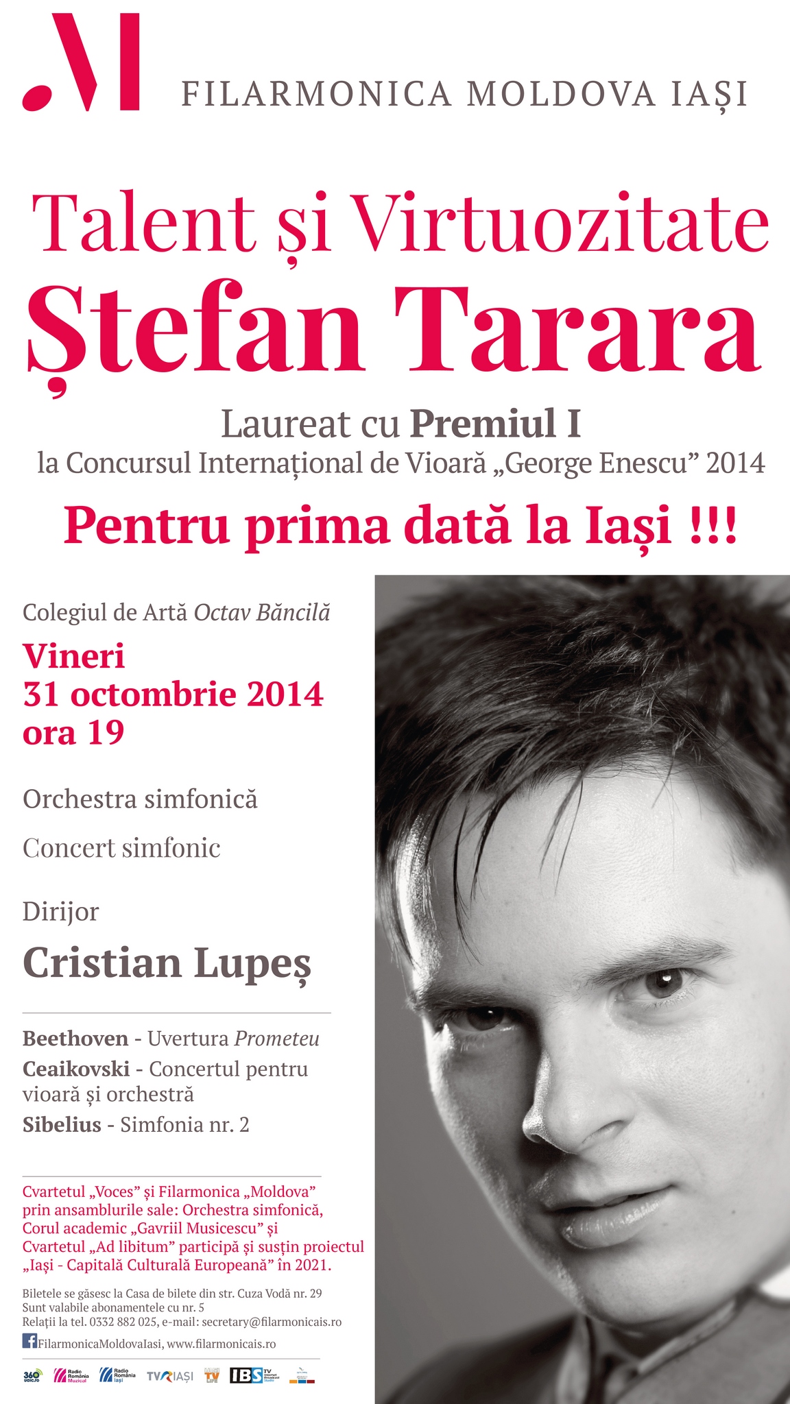 Vineri, 31 octombrie, Filarmonica „Moldova” din Iași are un invitat de excepție, pe violonistul ȘTEFAN TARARA, Laureat cu Premiul I la Concursul Internațional de vioară „George Enescu” 2014. Programul concertului cuprinde Uvertura Prometeu op. 43 de Ludwig van Beethoven, Concertul pentru vioară și orchestră în re major, op. 35 de Piotr Ilici Ceaikovski și Simfonia nr. 2 op. 43 în re major de Jean Sibelius. Dirijor: Cristian Lupeș Concertul începe de la ora 19.00 și are loc în sala de spectacole a Colegiului de Artă „Octav Băncilă” După repetiţia din dimineaţa concertului, Ştefan Tarara şi Cristian Lupeş au avut amabilitatea să acorde interviuri în exclusivitate pentru Radio Iaşi