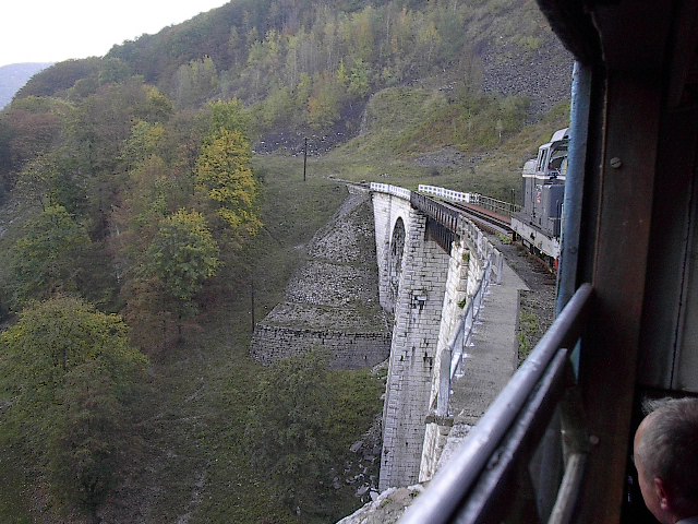 O zi însorită de toamnă, face posibilă această călătorie căci în acest anotimp impactul vizual este cel mai de esenţă. Începem fascinanta călătorie pe calea ferată Oraviţa-Anina chiar în momentul în care păşim pe peronul primei staţii CF din România, gara Oraviţa, amenajată la 1847. De pe peronul, aflat la etajul clădirii care o găzduieşte, care prin lipsa forfotei aminteşte de atmosfera gării unui oraş de munte din anii 30, ne cumpărăm tichetele şi plecăm printre celelalte vagoane garate în triaj în căutarea garniturii special destinate călătoriei către Anina. În timp ce ne căutam locurile şi aşteptam cu răbdare, pe banchetele din lemn într-unul din cele două vagoane ataşate unei locomotive Diesel moderne, fluierul scurt al impiegatului de mişcare, ne-ai mai rămas la dispoziţie câteva clipe să admirăm zona prin geamurile mici ale vagonului, care se deschid doar pe lăţimea de-o palmă. Pe dreapta se poate admira panorama Văii Caraşului, iar pe stânga tot mai aproape Munţii Aninei, pe care îi vom înconjura refăcând virtual traseul căii ferate montane. La ora 14:50 fix, în urma unui semnal acustic scurt, garnitura se pune în mişcare. Locomotiva “STEYERDORF“ de altă dată construită în anul 1862 la Viena a fost înlocuită cu o locomotivă DIESEL pe ecartament normal, fabricată la Reşiţa în anii 60, însă care păstrează multe din vechile tehnici de conducere, în special în ceea ce priveşte viteza de deplasare şi înscrierea milimetrică în curbele extrem de strâmte de pe traseu. Trenul părăseşte gara ca pe vremea bunicilor punându-se în mişcare înspre direcţia “Steirawald“ (Pădurea Steier). Nici o altă rută feroviară din ţară nu este aşa de bogată în construcţii arhitecturale atât de impunătoare. Traseul în lungime de 34 de kilometri având o diferenţă de nivel de 340 de metri, între punctul de plecare şi destinaţia finală, străbate 14 tuneluri săpate în stâncă, în lungime totală de peste 2.084 de metri, pe o distanţă de aproximativ 21de kilometri şi 10 viaducte însumând 843 de metri. Calea ferată şerpuieşte peste 10 kilometri de ziduri de sprijin clădite manual cu precizia tehnicilor constructorilor germani, peste 21,2 kilometri de coridoare cioplite în rocă şi de aproximativ 10 kilometri însumând o seamă de viaducte şi poduri peste văi adânci de 35 de metri.