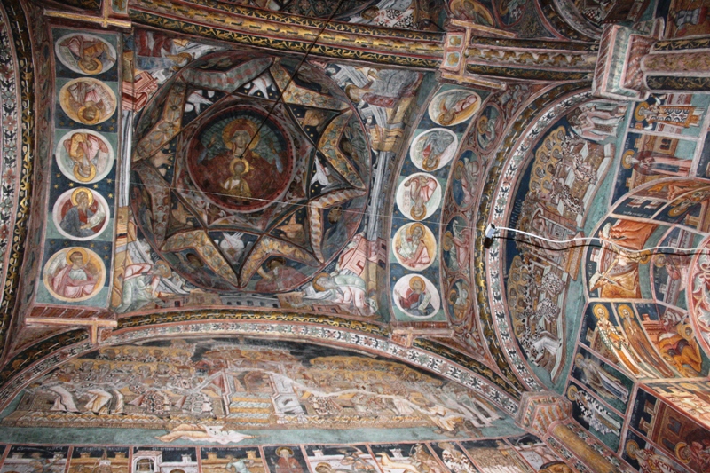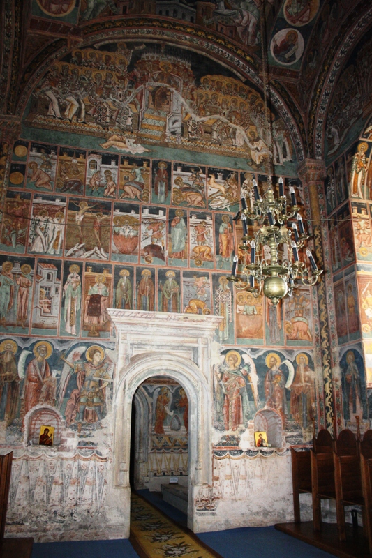 Pictura din interior a fost executată în tehnica frescă în 1536, cu unele refaceri în 1550 şi restaurată în 1844, când s-au refăcut picturile din altar, încăperea mormintelor şi naos. Numai pictura din pronaos şi pridvor a rămas în cea mai mare parte originală. Pe bolta pridvorului se afla scena „Judecata de Apoi”, pictată prima oară aici şi la Umor. [youtube height=”HEIGHT” width=”WIDTH”]https://www.youtube.com/watch?v=Ap-YcwZq5l4[/youtube]