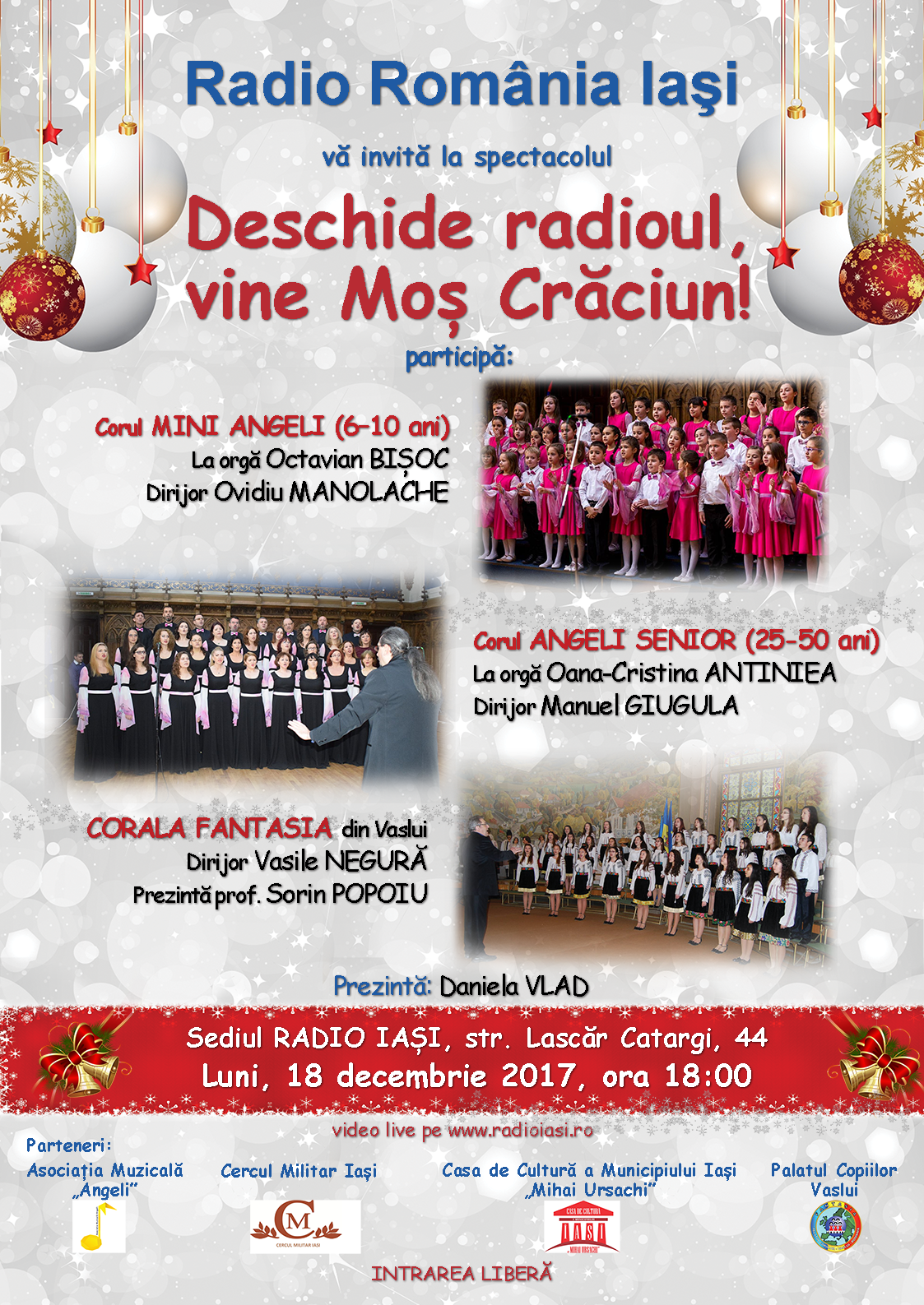 Prima pagină » Evenimente » Evenimente Radio Iaşi » 18.12.2017- Spectacolul „Deschide radioul, vine Moș Crăciun!” 18.12.2017- Spectacolul „Deschide radioul, vine Moș Crăciun!” Publicat de Iuliana Bubuianu, 12 decembrie 2017, 17:58 Share pe Facebook Share pe Whatsapp Share pe X Etichete: