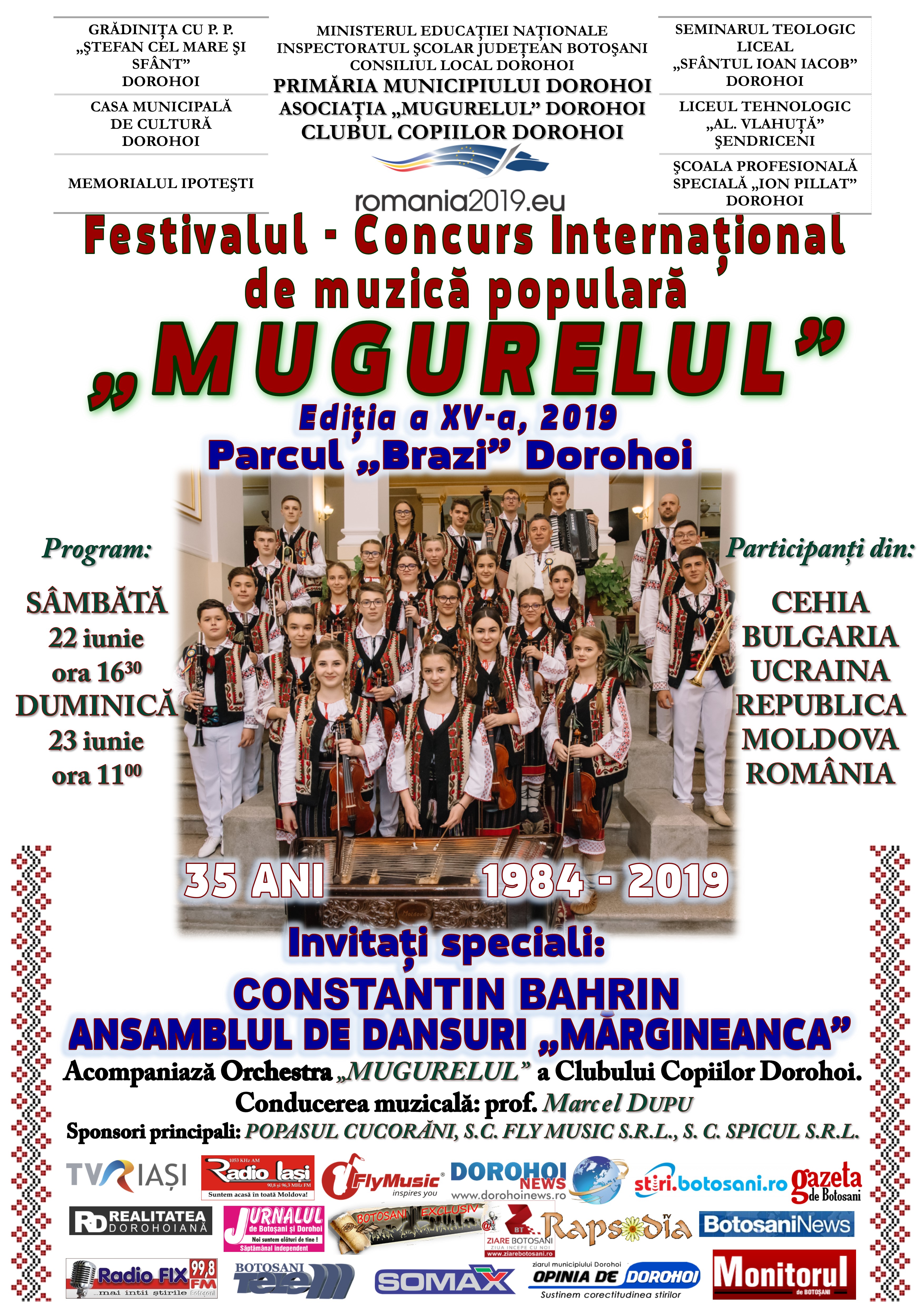 A XV-a ediție a Festivalului Internațional de muzică populară ,,Mugurelul”-Dorohoi se desfășoară sâmbătă 22 iunie 2019 (de la ora 16:30) și duminică 23 iunie 2019 (începând cu ora 11:00), pe scena Parcului ,,Brazi” din municipiul Dorohoi. [divider scroll_text=”SCROLL_TEXT”] [youtube height=”HEIGHT” width=”WIDTH”]https://www.youtube.com/watch?v=0_eCpTC9_DM[/youtube] [space height=”HEIGHT”] [divider scroll_text=”SCROLL_TEXT”]