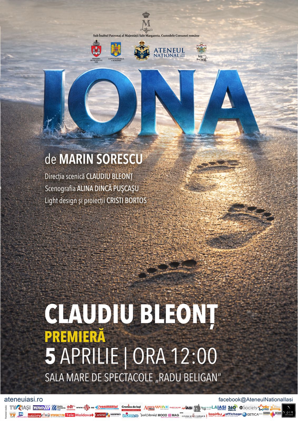 Ateneul Național din Iași invită publicul duminică, 5 aprilie 2026, la un eveniment cultural de excepție: dubla reprezentație a spectacolului „IONA”, de Marin Sorescu. Producția, semnată de celebrul actor Claudiu Bleonț, care deține și rolul principal, va avea avanpremiera la ora 12:00 și premiera la ora 19:00, în Sala Mare de Spectacole „Radu Beligan”.