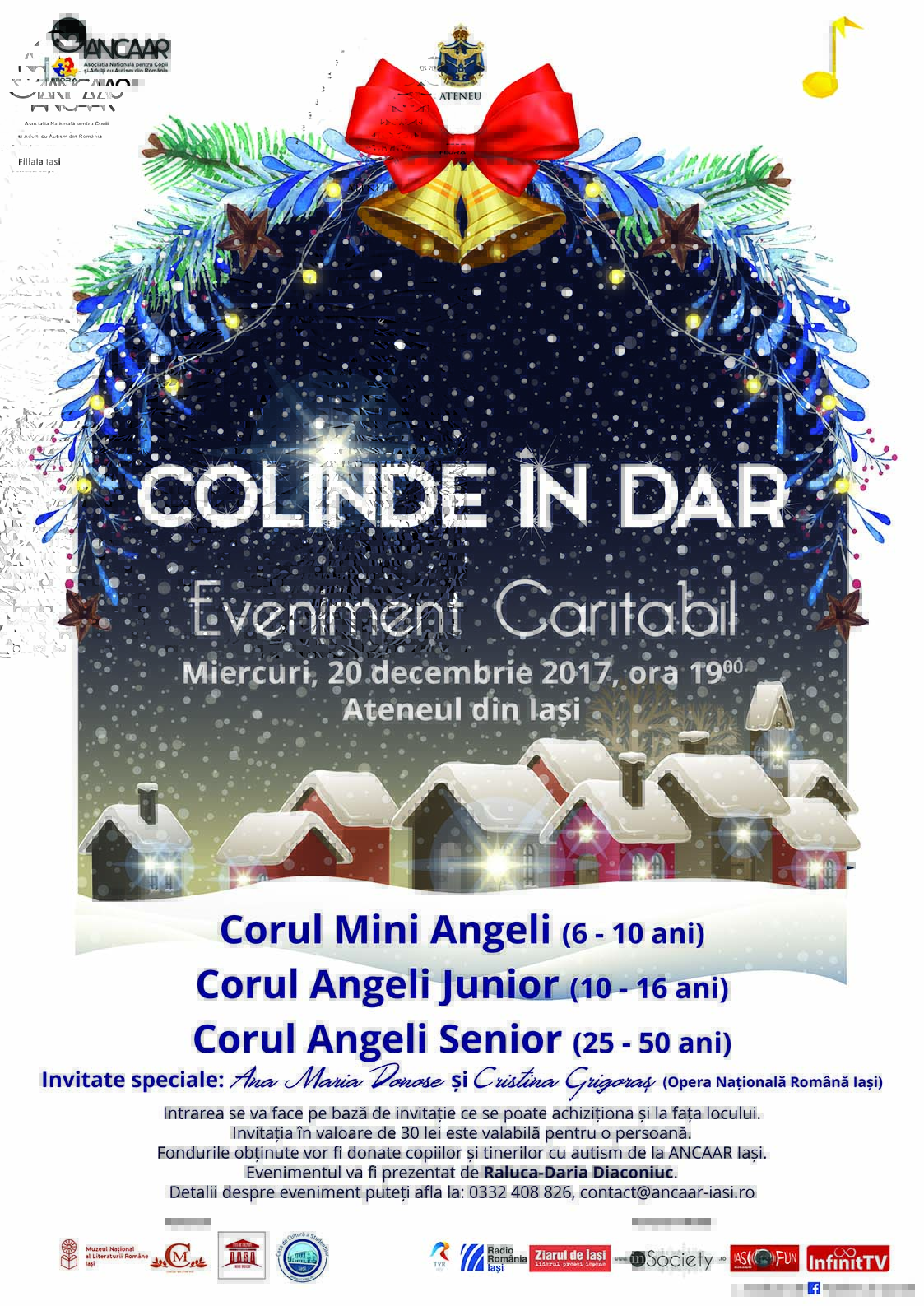 Asociația Națională pentru Copii și Adulți cu Autism din România (A.N.C.A.A.R.) – filiala Iași, împreună cu Asociația Muzicală „Angeli”, organizează miercuri, 20 decembrie 2017, ora 19.00, la Ateneul din Iași, spectacolul caritabil “Colinde in dar”.