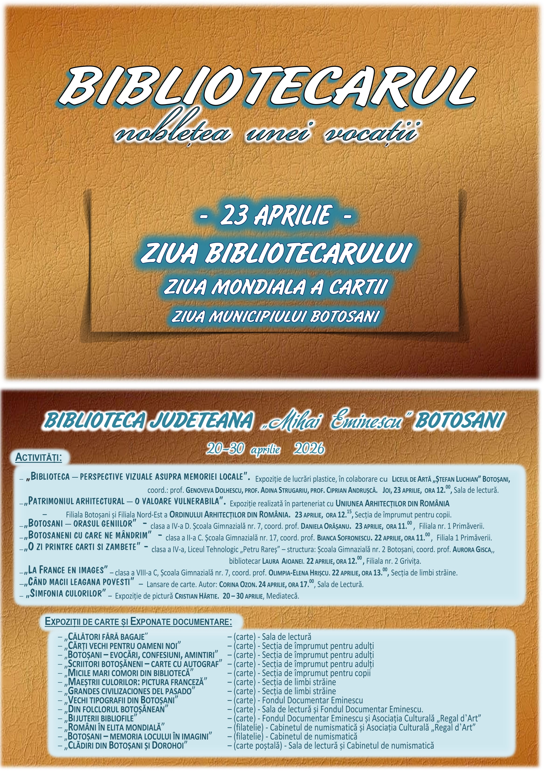 Biblioteca Județeană „Mihai Eminescu” Botoșani marchează Ziua Bibliotecarului din România și Zilele Municipiului Botoșani printr-o serie de activități culturale dedicate promovării memoriei locale botoșănene. Prin valorificarea colecțiilor speciale și a fondului de carte, spațiile bibliotecii vor oglindi, prin intermediul documentelor, imaginilor și interpretărilor artistice, memoria vie a comunității botoșănene.