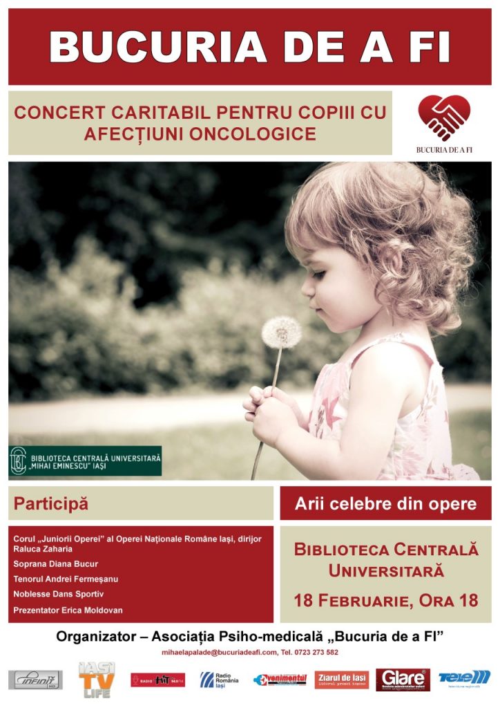 În fiecare an, pe 4 februarie se sărbătorește Ziua mondială de luptă împotriva cancerului, iar pe 15 februarie – Ziua internațională a copilului bolnav de cancer. În acest sens, Asociația Psiho-medicală „Bucuria de a fi” din Iași, care se ocupă de problematica persoanelor diagnosticate cu afecțiuni oncologice, va organiza un concert caritabil pe 18 februarie, la ora 18, la Biblioteca Centrală Universitară „Mihai Eminescu”.