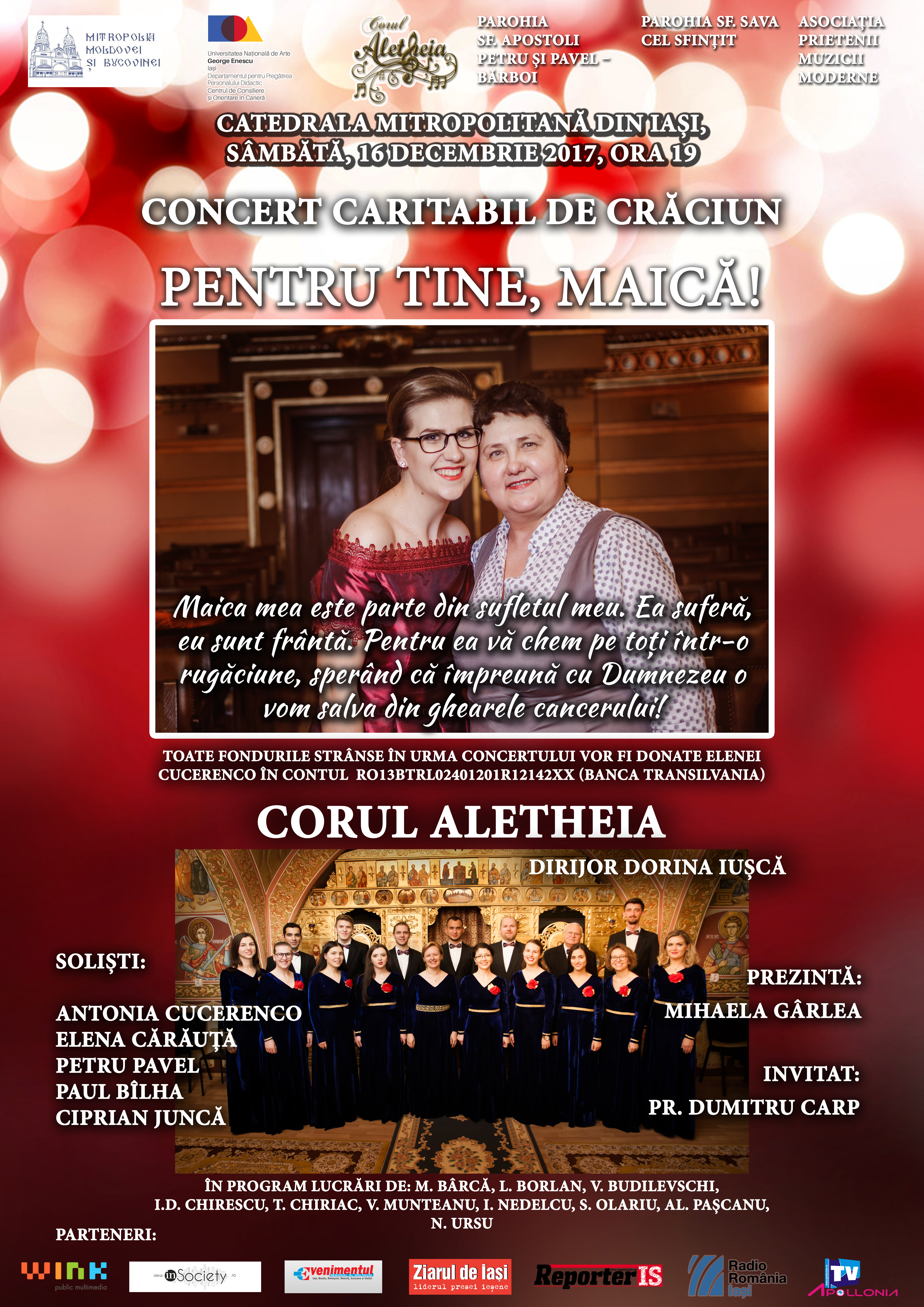 Mitropolia Moldovei și Bucovinei, Universitatea Națională de Arte „George Enescu” din Iași, Parohia „Sf. Apostoli Petru și Pavel” – Bărboi, Parohia „Sf. Sava cel Sfințit”, Asociația „Prietenii Muzicii Moderne” și Corul Aletheia vă învită sâmbătă, 16 decembrie, ora 19 la Catedrala Mitropolitană din Iași la un Concert caritabil de excepție: „Pentru tine, Maică!”.