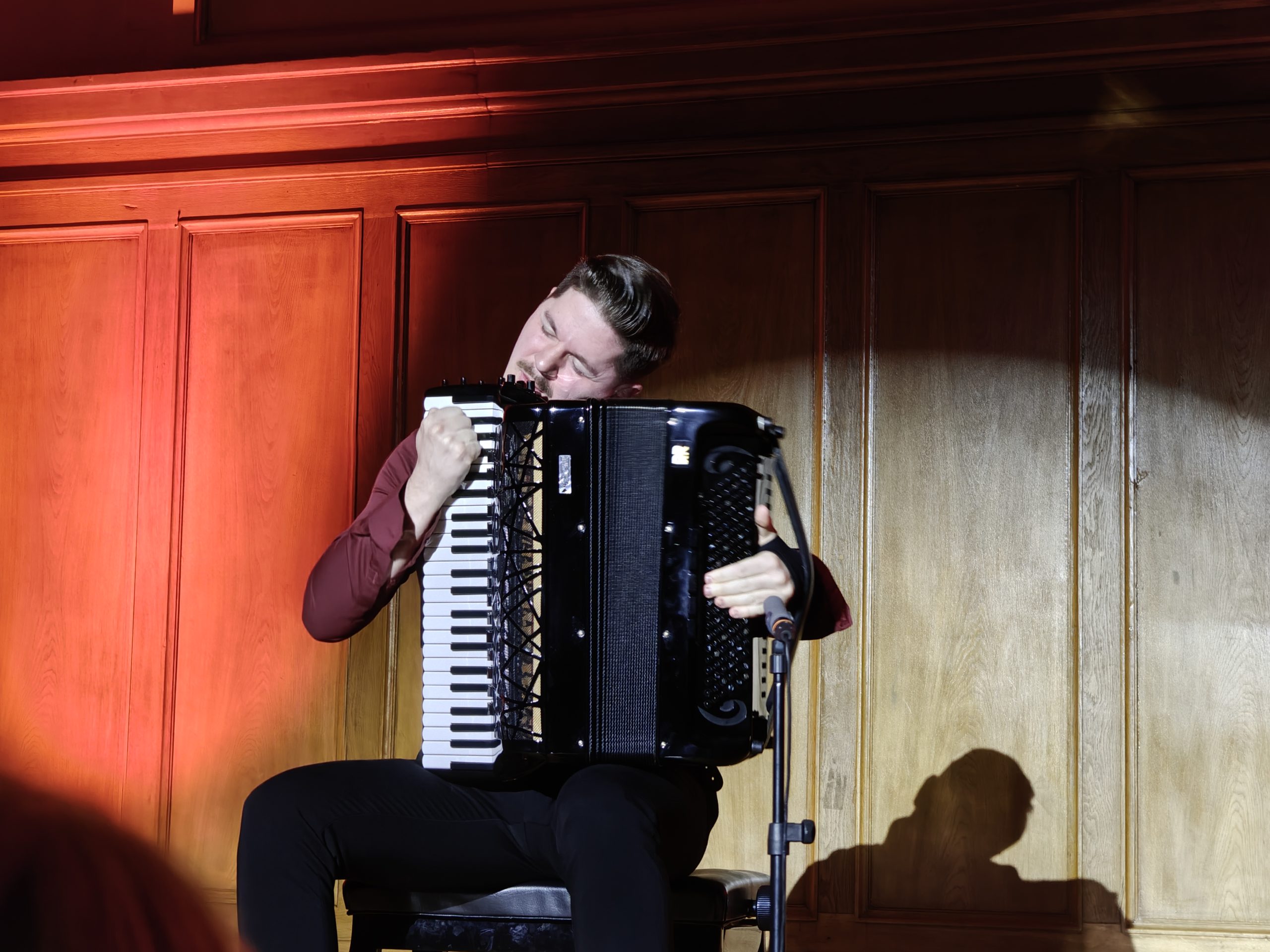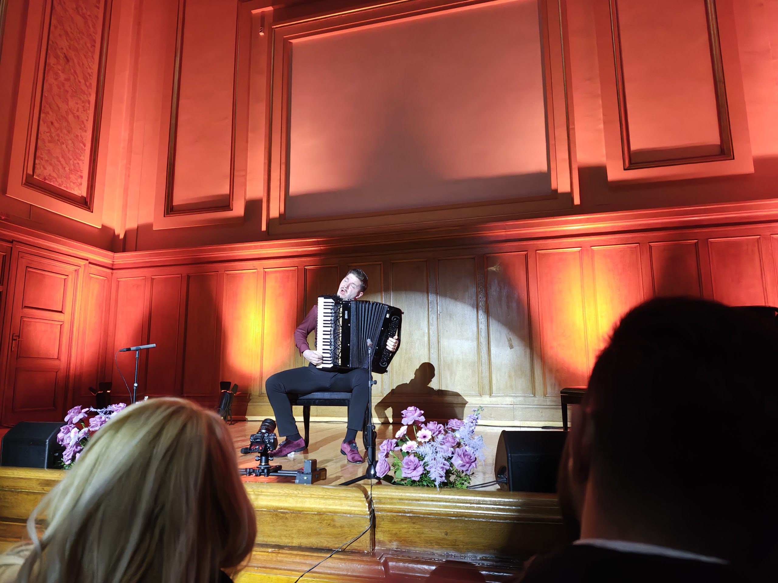 Radu are întotdeauna umor și prezentări delicioase, apoi se transformă în Mefisto sau înger, ne ține cu sufletul la gură, de respirăm doar o dată cu el, zguduie acordeonul și-l face să scoată niște armonii incredibile, groase, păstoase sau diafane (clustere, despre care ne spunea în concert) și apoi, după ce se scutură puțin și mulțumește pentru aplauze, pe fața lui apare un zâmbet uimitor de solar și fericit. Nu poți să nu admiri acest tânăr atât de puternic, care ține în brațe un instrument de vreo 25 de kilograme și îl face una cu corpul său, într-o vibrație unică și impresionantă.
