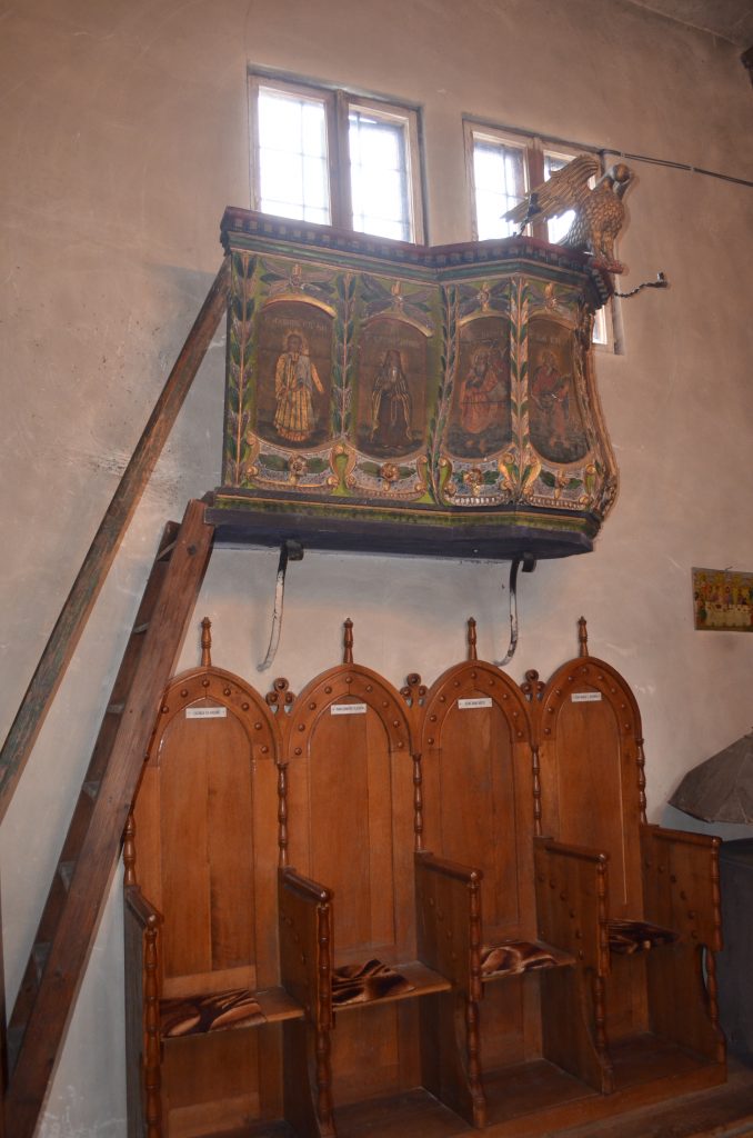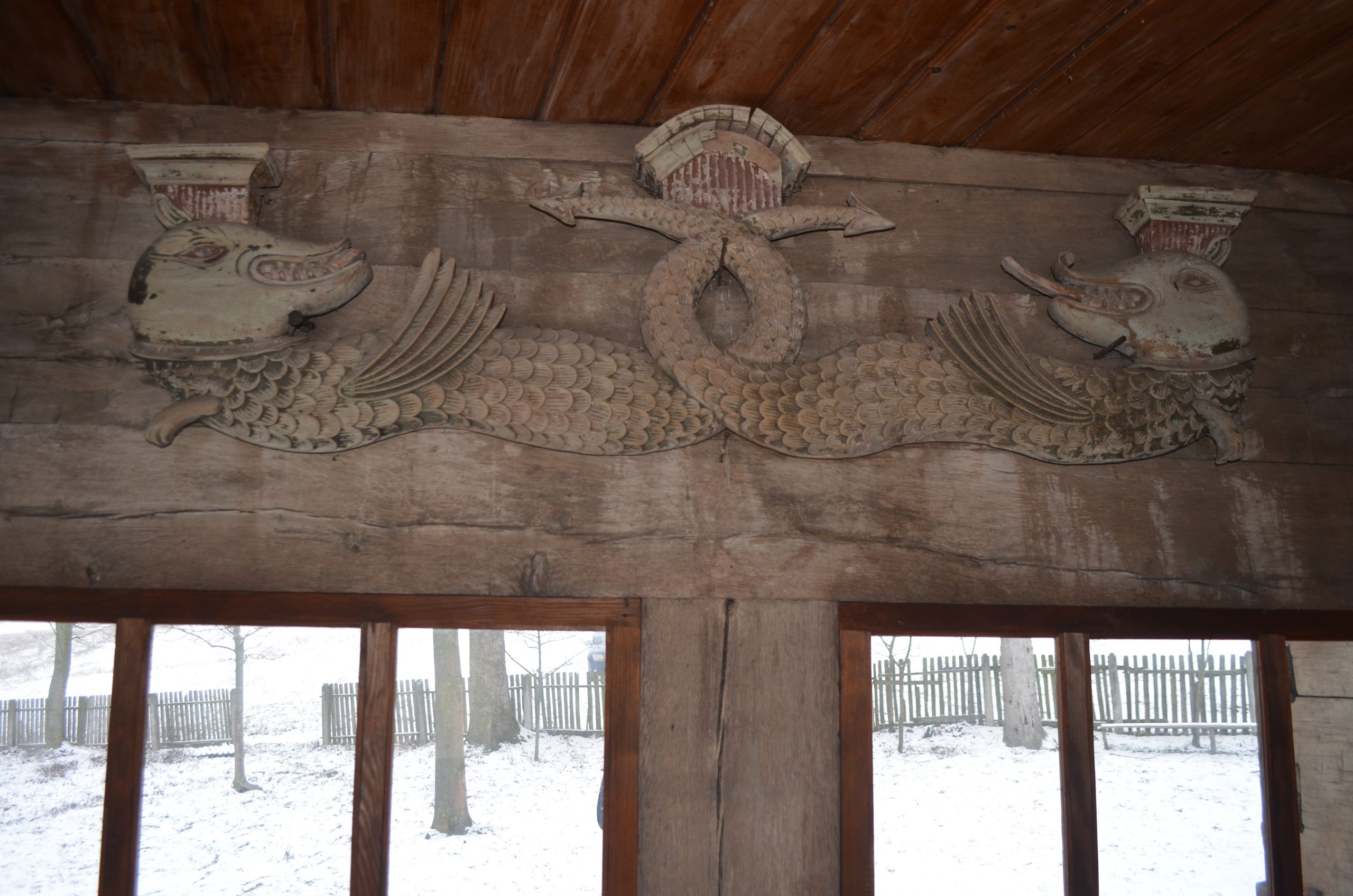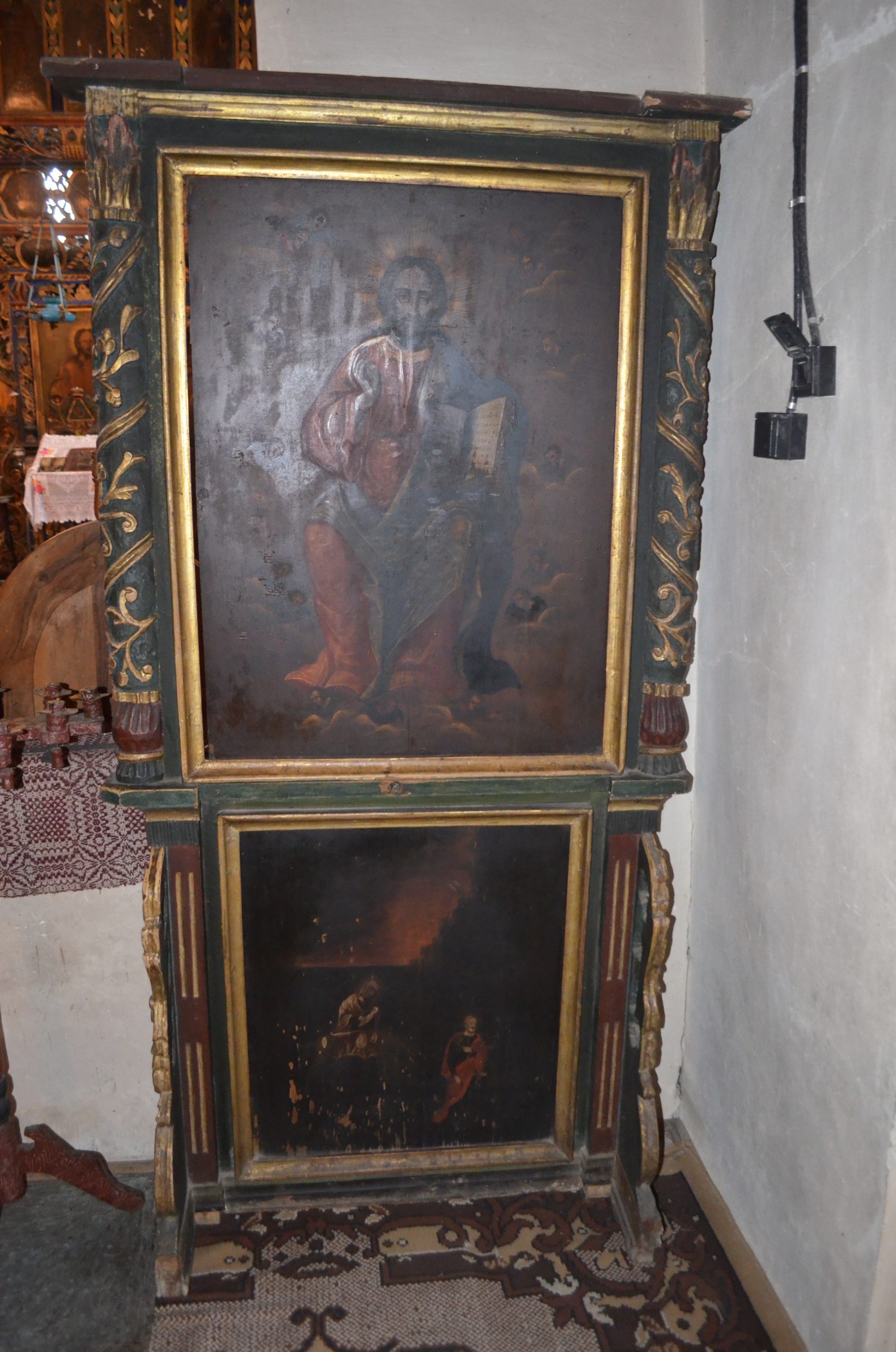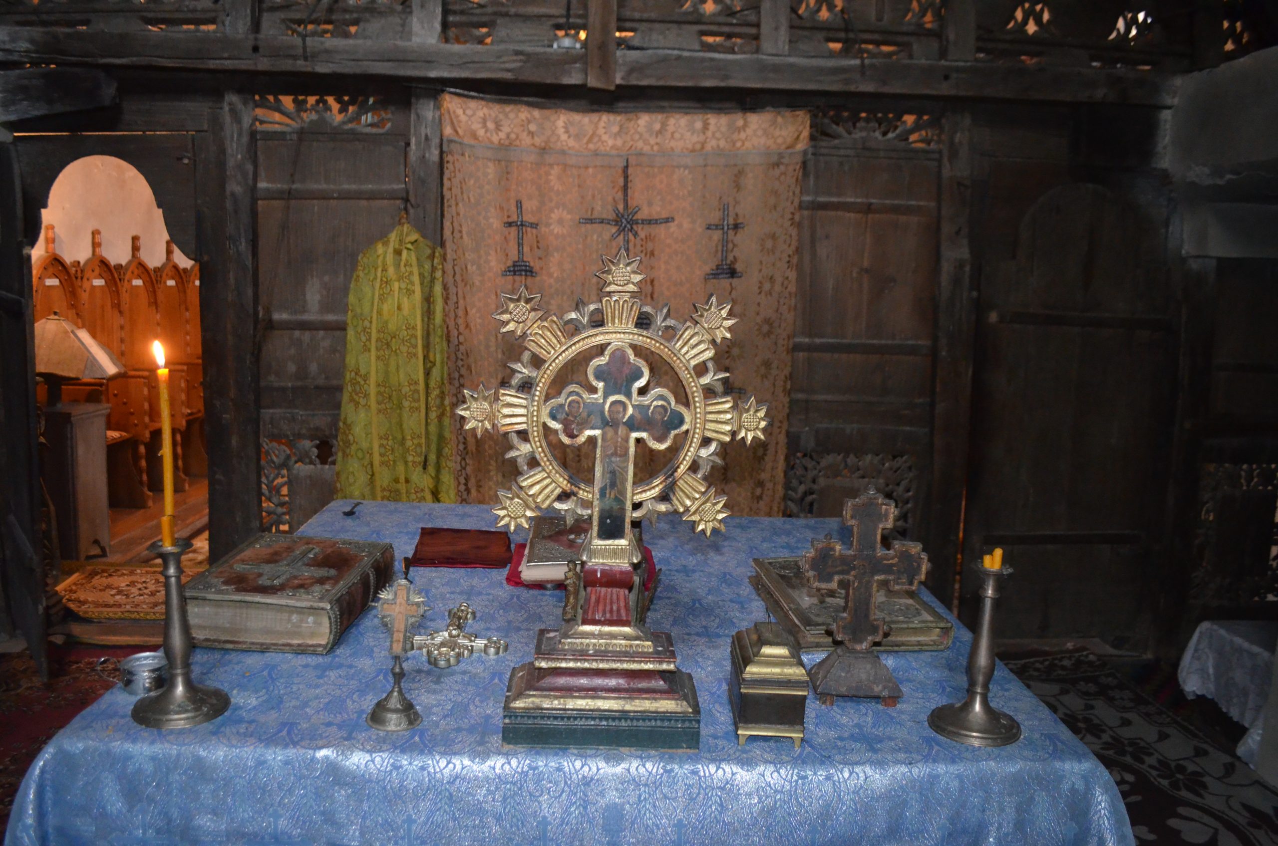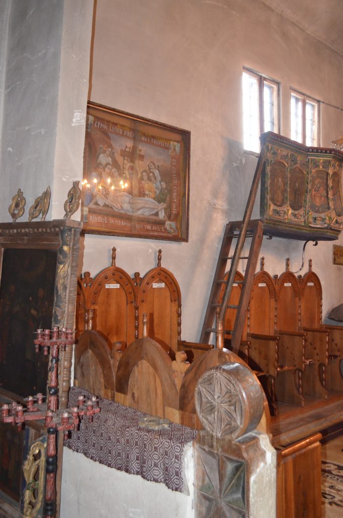 Pridvorul este lucrat din bârne de ștejar; aici apar figuri fantastice deasupra ușii de la intrare, sub o serie de sculpturi florale, cinci rozete de ornament făcute de meșterul respectiv, inscripția: „1802, mai 21”pronaosul se desface printr-o serie de stâlpi de stejar care susțin bolta; în partea de miazănoapte se află mormântul ctitorului, de remarcat fiind și naosul dreptunghiular (deasupra lui se înalță o turlă de lemn decorativă), ferestrele așezate lateral, acoperișul naosului, bolta în plin centru, forma fundului de corabie; în naos se află amvonul sculptat și ornamentat cu icoane (totodată, în interior se află jilţul boieresc din lemn masiv, alături de amvonul sculptat cu măiestrie în lemn, protejat de un vultur).