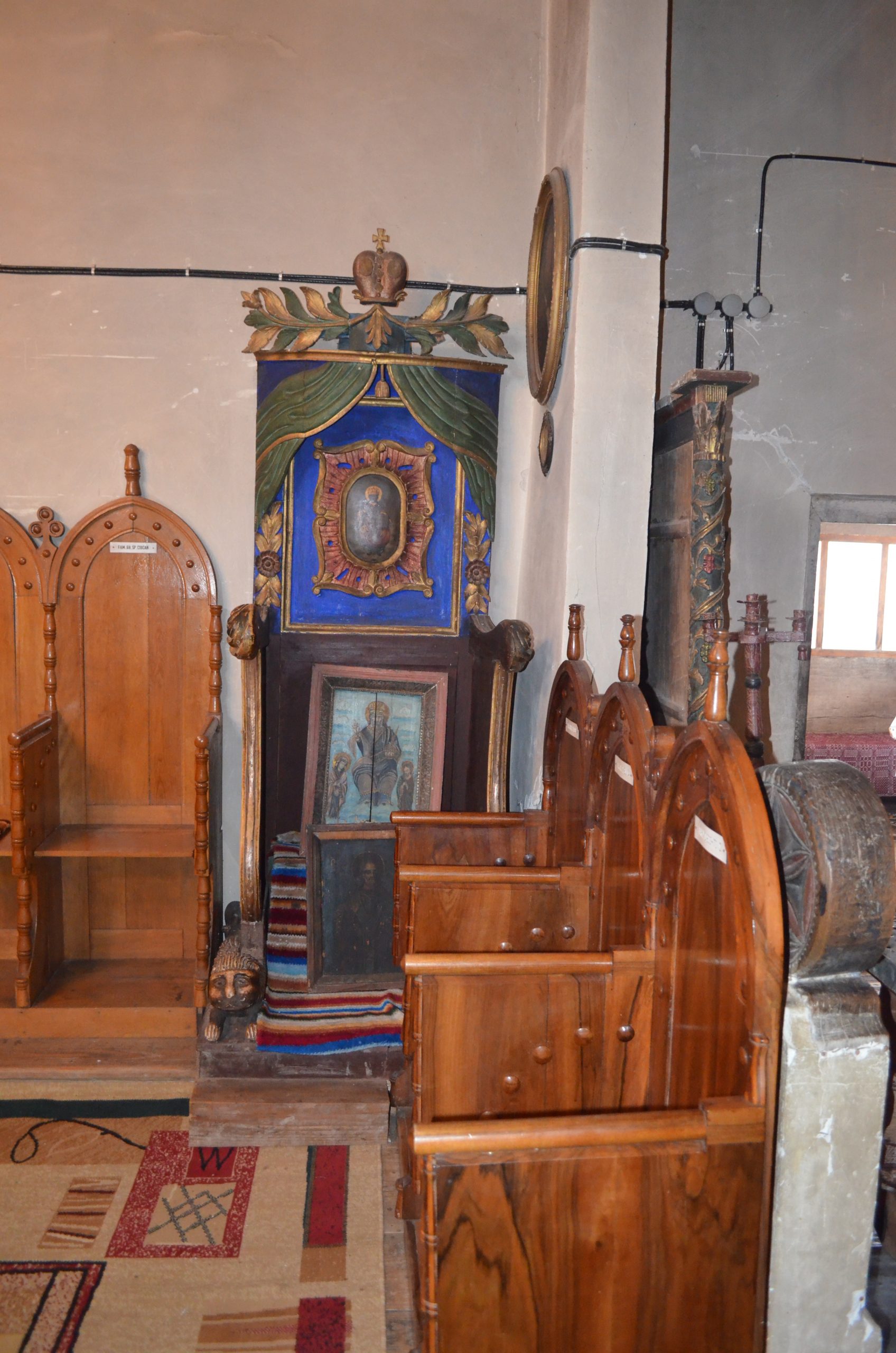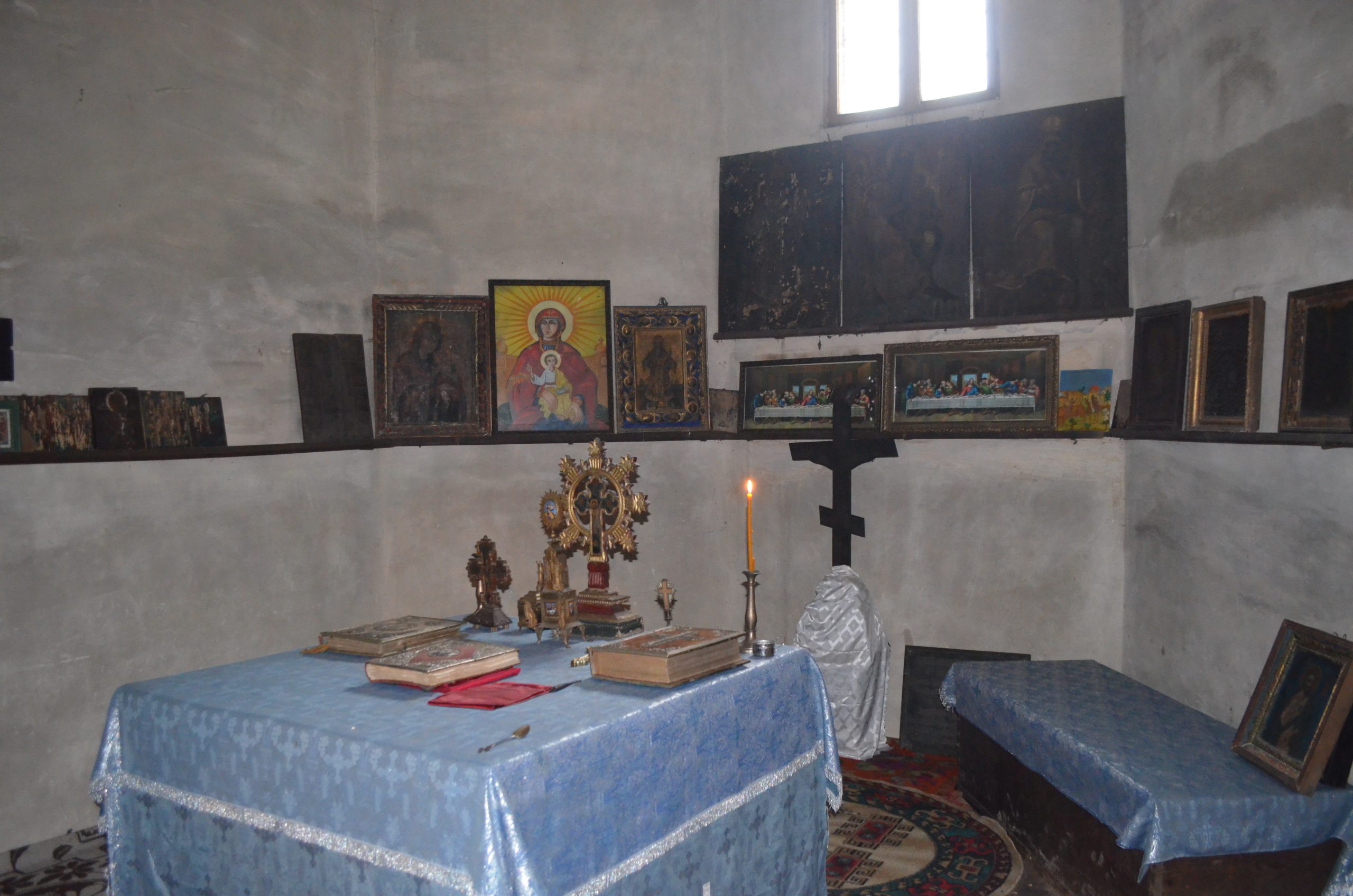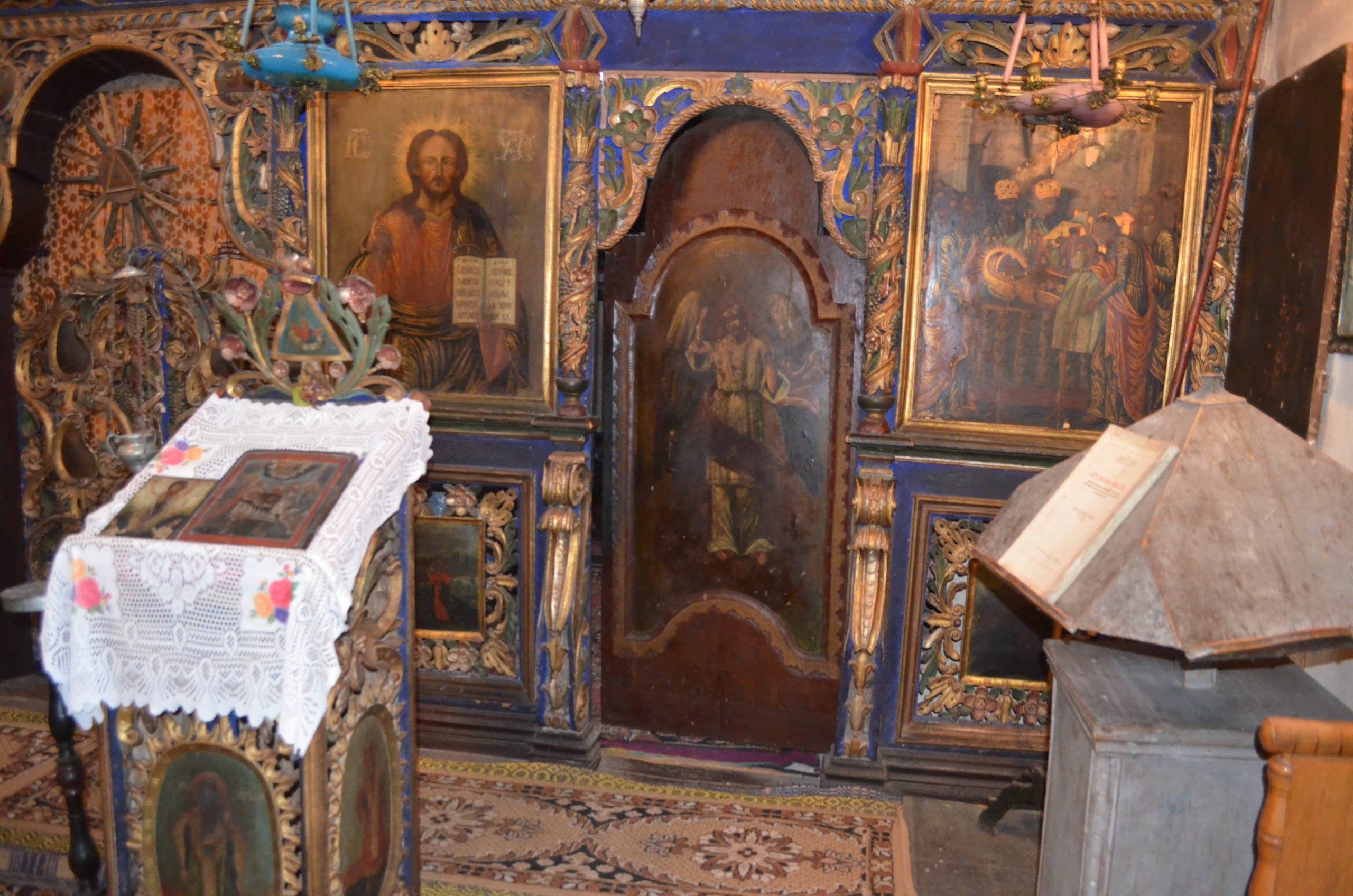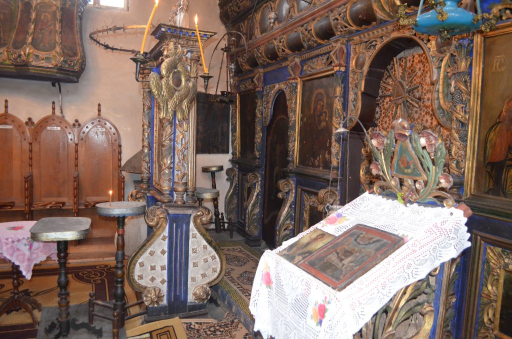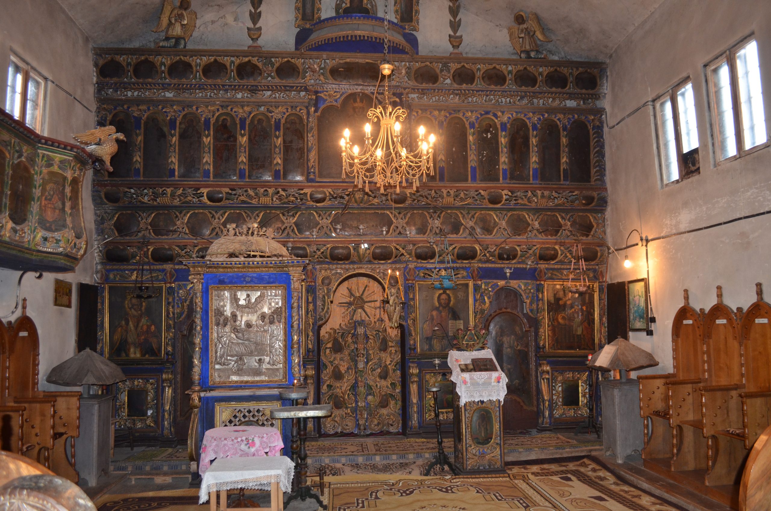 Catapeteasma (model al măiestriei artei lemnului) este formată din șapte rânduri de icoane; acestea sunt încadrate în coloane cilindrice, cu baza și capitelul profilate, având sculpturi poleite cu aur (vegetale, ramuri, frunze, strugurei); icoanele sfinților sunt pictate în stil bizantin). Strana Maicii Domnului, cu icoana de argint are, în partea inferioară, inscripția: „Această sfântă icoană s-a făcut de robii lui Dumnezeu Alexandru, Anica și fiul lor George, familia Curt, anul 1854 martie 11 zile” iar în partea de sus putem citi: „Adormirea Prea Sfintei Născatoarei de Dumnezeu”. Altarul, despărțit de naos prin catapeteasma din lemn de tei, are formă semicirculară.