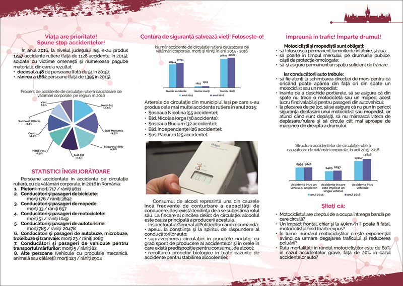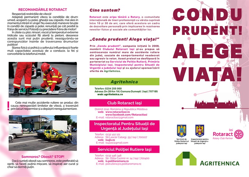 Peste 500 de pliante cu informații referitoare la importanța conducerii preventive și 500 de autocolante cu mesajul campaniei vor fi distribuite automobiliștilor și motocicliștilor aflați în trafic, de către membrii Asociației Club Rotaract Iași, cu susținerea unui echipaj al Serviciului Poliției Rutiere Iași. Aceștia vor răspândi mesajul campaniei naționale a Poliției Rutiere, „Alege Viața!”, și vor invita participanții la trafic să testeze efectele unui accident auto în simulatorul de impact „Crash”, al Facultății de Mecanică din cadrul Universității „Gheorghe Asachi” din Iași.