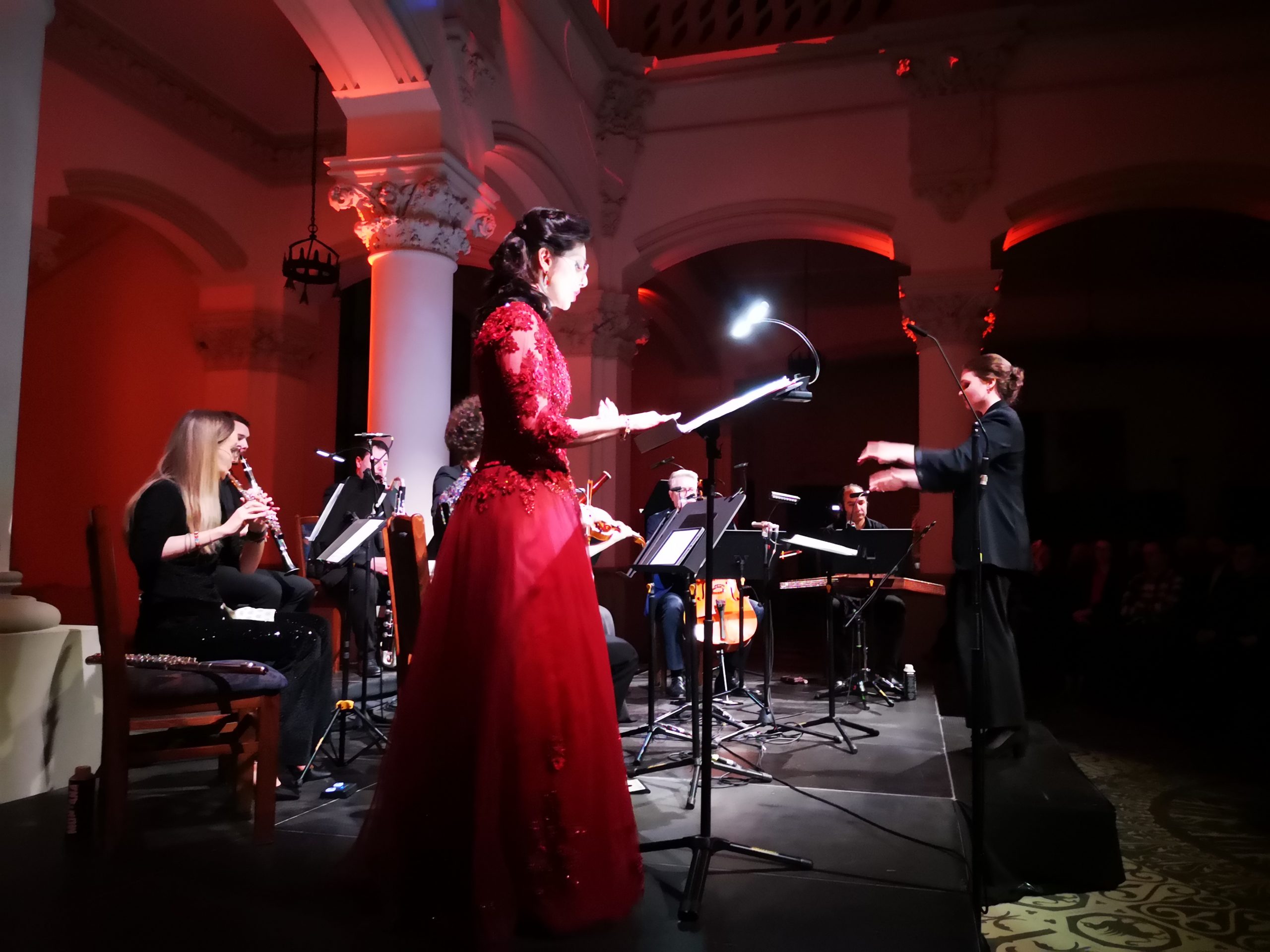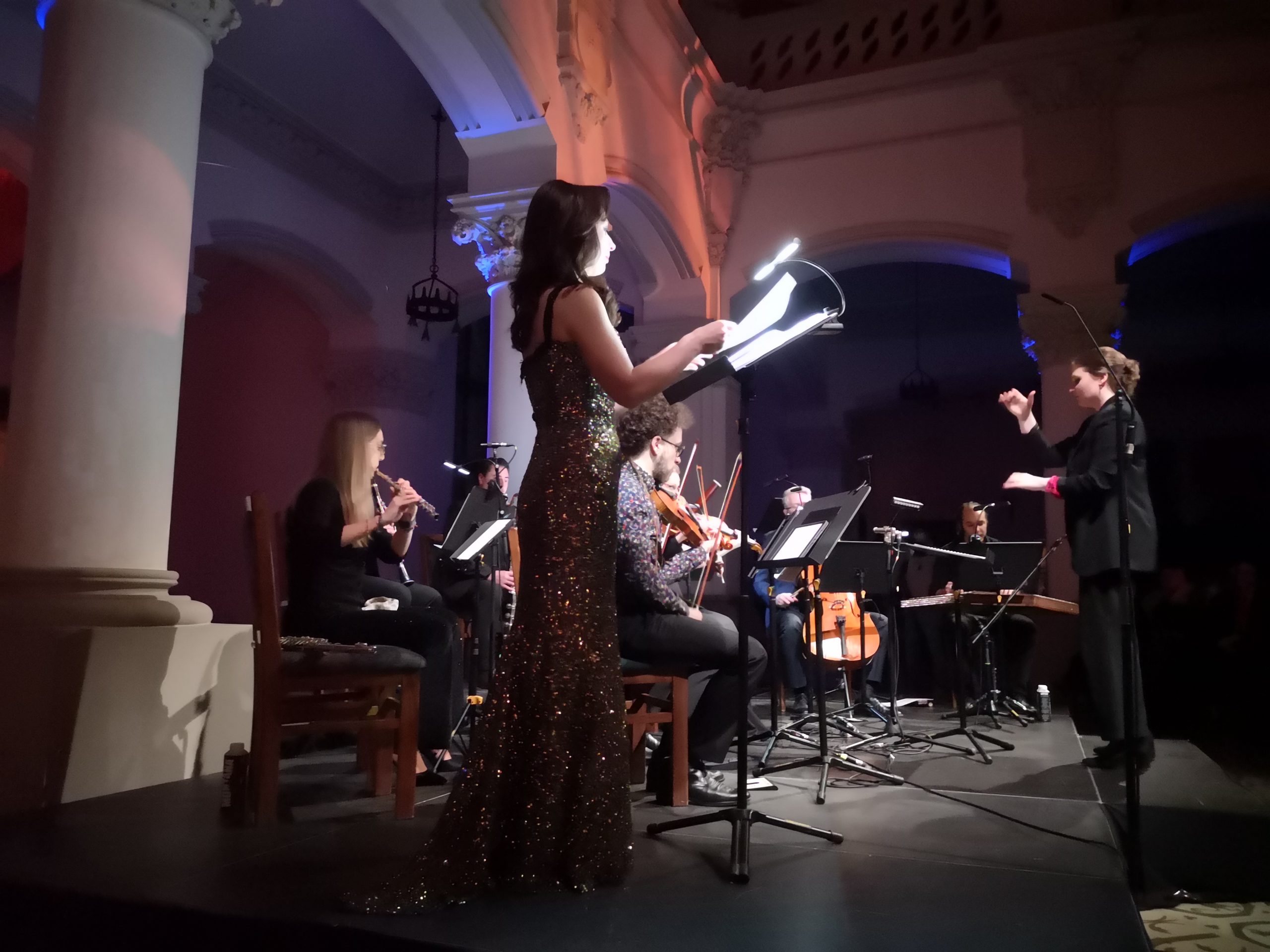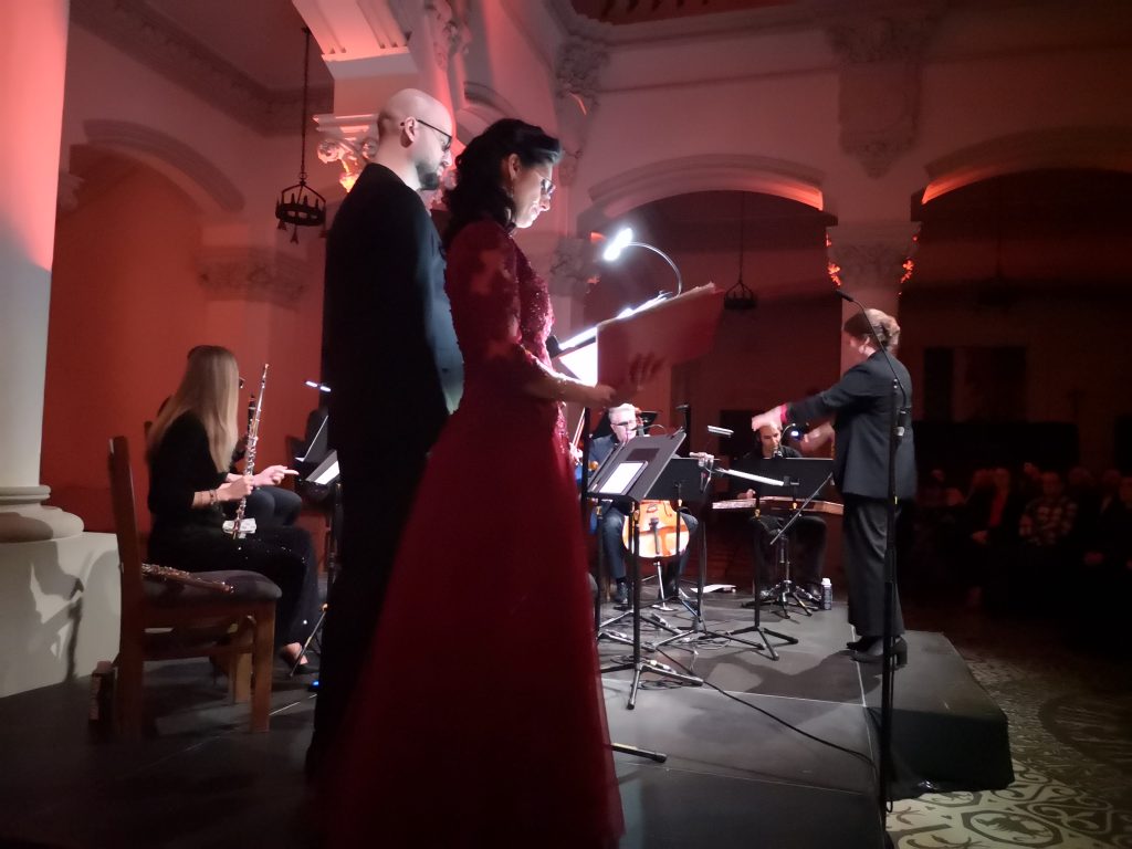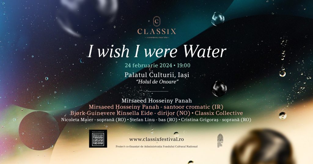 Muzică persană într-o minunată haină occidentală, fără să-și piardă identitatea sau farmecul? Da, asta am ascultat, poeziile poetului Ahmad Shamlou, mare figură poeziei persane contemporane, pe o muzică în care texturi orchestrale moderne se amestecă cu valurile sunetelor de santur, iar cele trei voci intonează un adevărat manifest pentru umanitate, în tonuri modale învăluitoare cu miresme orientale. Mirsaeed Hosseiny Panah este un compozitor și interpret la santur (harpă persană așezată orizontal, ca țambalul), profesor de compoziție (inclusiv occidentală) la Universitate în Iran, cu studii de jazz în Norvegia, care a găsit limbajul comun între toate aceste stiluri. Muzica sa este inteligibilă, umană și mângâietoare, scriitura pare limpede și ușor de interpretat, dar cu destule provocări și subtilități greu de pătruns pentru interpretul occidental. Mirsaeed spune că interpretarea muzicienilor ieșeni diferă de cea din Norvegia și că de fiecare dată se simte inspirat să mai modifice partitura. I-a plăcut mult și este recunoscător pentru rezultatul colaborării de aici, iar noi am admirat capacitatea artiștilor noștri de a asimila atât de multe noutăți și de a le reda admirabil. Orchestra Classix Collective a fost formată din muzicieni din orchestra Filarmonicii Moldova și profesori la UNAGE, cărora li s-a alăturat un prieten al festivalului prezent și în edițiile trecute, Sabin Penea. Componența: Sabin la vioară, Bogdan Onofrei – vioară, Cătălina Toma – violă, Sebastian Vîrtosu – violoncel, Carla Stoleru – flaut, Daniel Paicu – clarinet bas, Zaharia Hojbotă – clarinet, Adrian Moisuc – fagot. La santur cromatic, autorul, Mirsaeed Hosseiny Panah. ONRI a colaborat prin soliștii Cristina Grigoraș-Radu – soprană, Nicoleta Maier – soprană, Ștefan Linu – bas. Ansamblul a fost condus de tânăra dirijoare Bjørk-Guinevere Kinsella Eide din Norvegia. Artiștii au fost plasați astfel în Holul Palatului, încât în spatele lor vedeam coloanele ca un adevărat templu, sugerat de fluidele video colorate și de treptele care urcau către un cer mai senin, evocat deopotrivă de poezie și muzică.