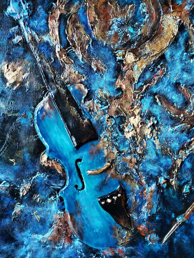 Picturalul dezvăluie o simbolistică a renașterii, a evoluției umane, a universului în dezlănțuiri cromatice de intensitate. Suprafețe energizante acaparează vizualul, scrutând în devenire forțe ascunse care evocă profunde introspecții. Descoperim, sub aceleași dimensiuni, ale muzicii, timpului și spațiului, un înger pierdut, un vortex muzical, o eliberare sau un captiv în sticlă. Sunetele sunt când blânde când electrice, când violete sau argintii. Paleta cromatică se manifestă sub semnul spiritualității și meditației, de la albastrul infinit la violetul înțelepciunii, în respirații de verde renăscut, la treceri dinamice de roșu pasional și omniprezent. Un portocaliu spontan, comunicativ învăluie spațiul cu bucurie, căldură și optimism. Linii fine de aur țes parcă destinul, oferind lumină și veselie. Elementele primare se desfășoară creând adevărate spectacole de lumină, dezvăluind, printr-o abordare îndrăzneață, perspective de interpretare și comunicare. Cele două arte se îmbină având ca finalitate exprimarea de sentimente și idei. Ating sufletul la nivel divin, pentru a ne ”purifica de praful” cotidian și pentru a ne purta pe tărâmuri de vis, cu bucurie, cu tristețe, uimire sau încântare. Amândouă au un limbaj universal (așa cum spunea despre muzică Henry Longfellow: ”muzica este limbajul universal al omenirii”). Muzica prin sunete iar pictura prin formă și culoare. Sunetele devin picturale iar picturalul devine o adevărată simfonie. Și iată cele două arte care au supraviețuit și s-au dezvoltat peste timp, relaționează într-o ritmicitate și vibrație specifice pentru a ne purta dincolo de spațiul și timpul trăit, cunoscut, oferind sufletului și imaginarului posibilități infinite. Un timp sonor, un timp cromatic într-un spațiu ad infinitum.