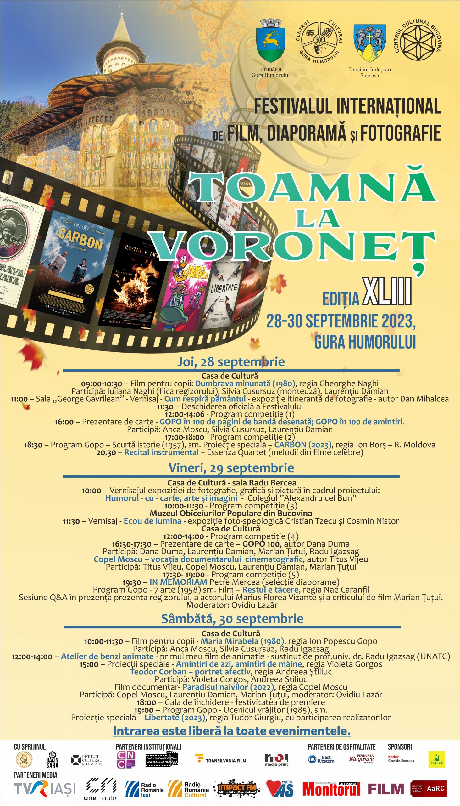 Ediția cu numărul 43 a Festivalului Internațional de Film, Diaporamă și Fotografie „Toamnă la Voroneț” se desfășoară în perioada 28 – 30 septembrie 2023, cu un program bogat: proiecții ale filmelor din competiție, vernisaje ale expozițiilor de fotografie, prezentare de carte, program Gopo, ateliere de bandă desenată pentru copii, dezbatere, proiecții în avanpremieră, proiecții speciale a unor filme consacrate în prezența regizorilor și actorilor din rolurile principale, sesiune Q&A cu participanții la festival.